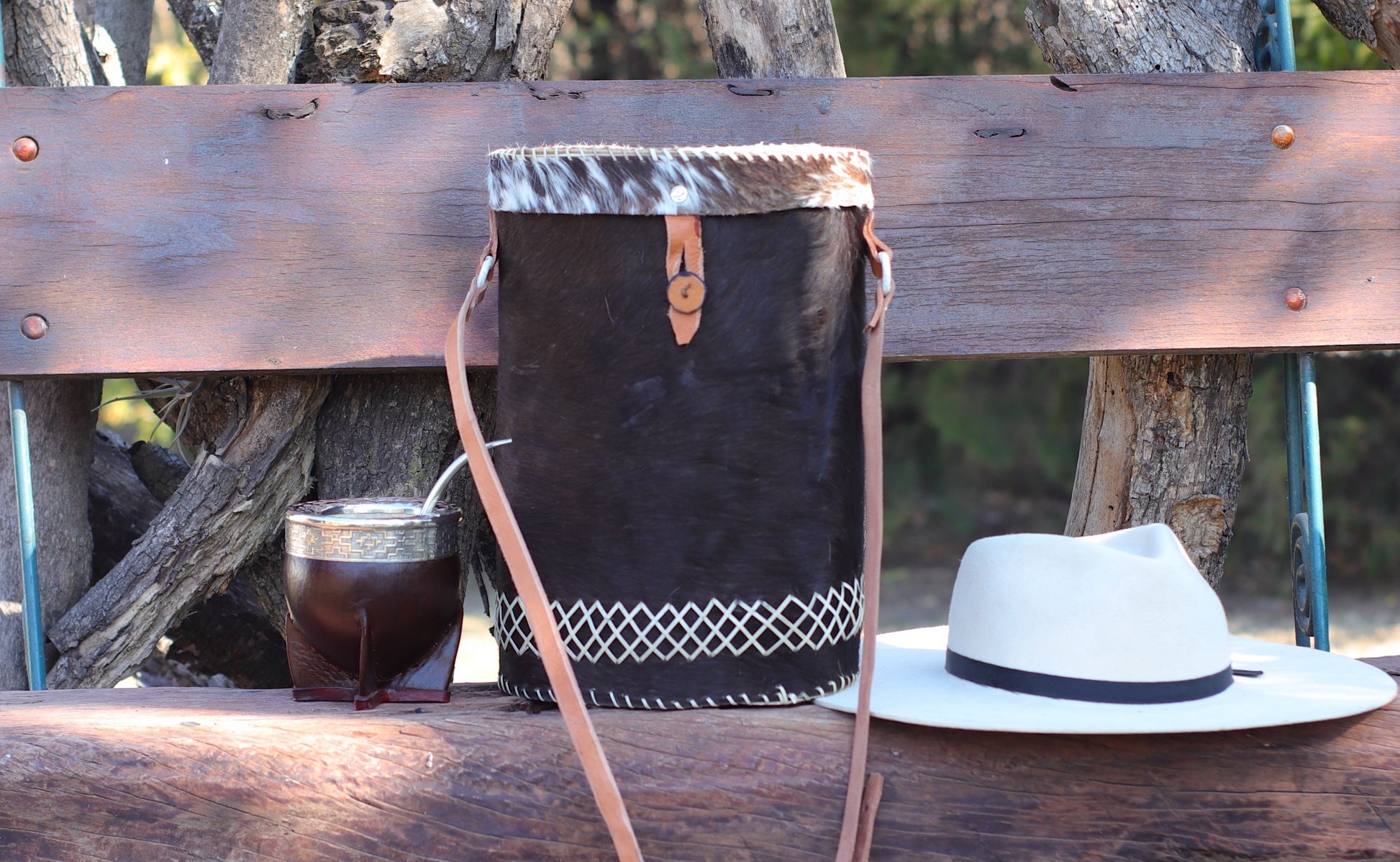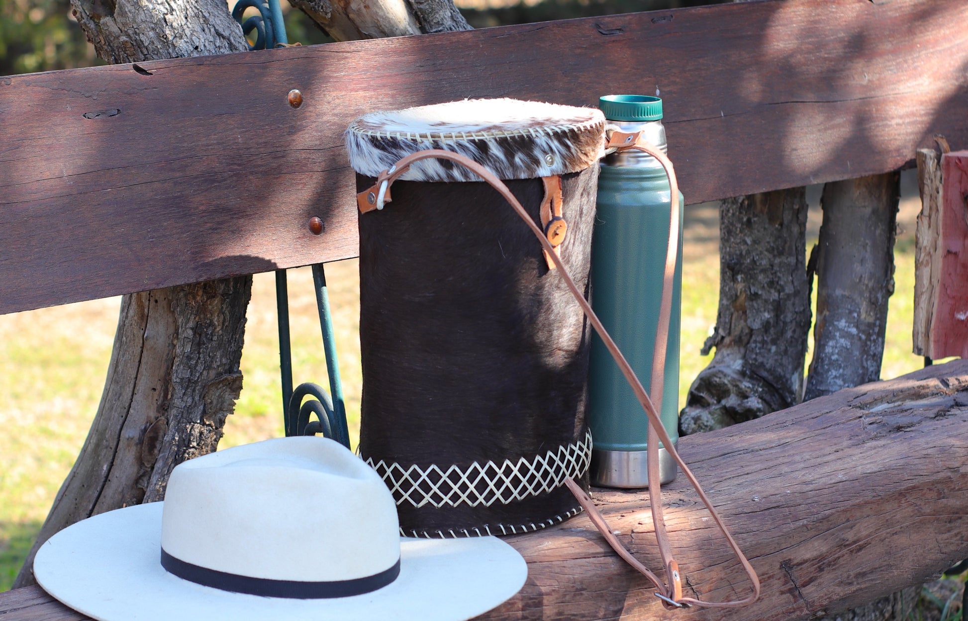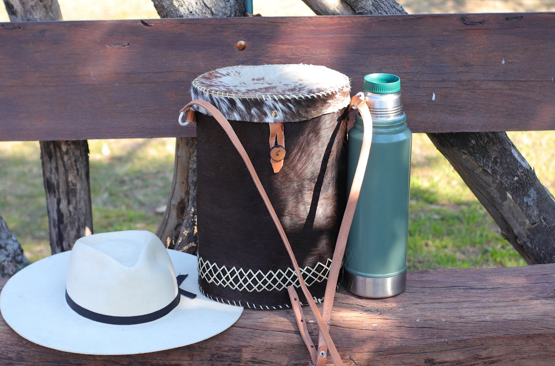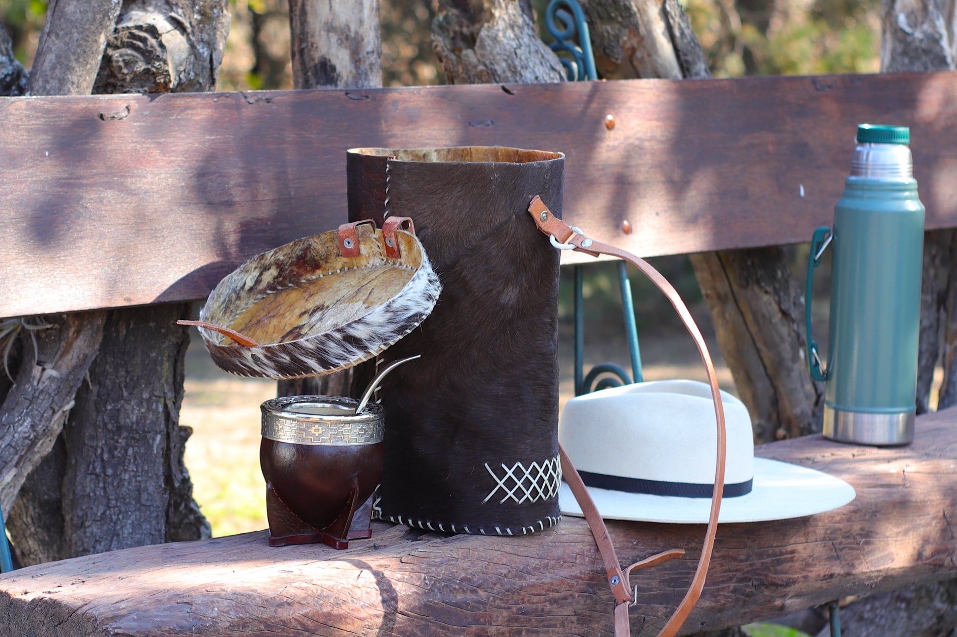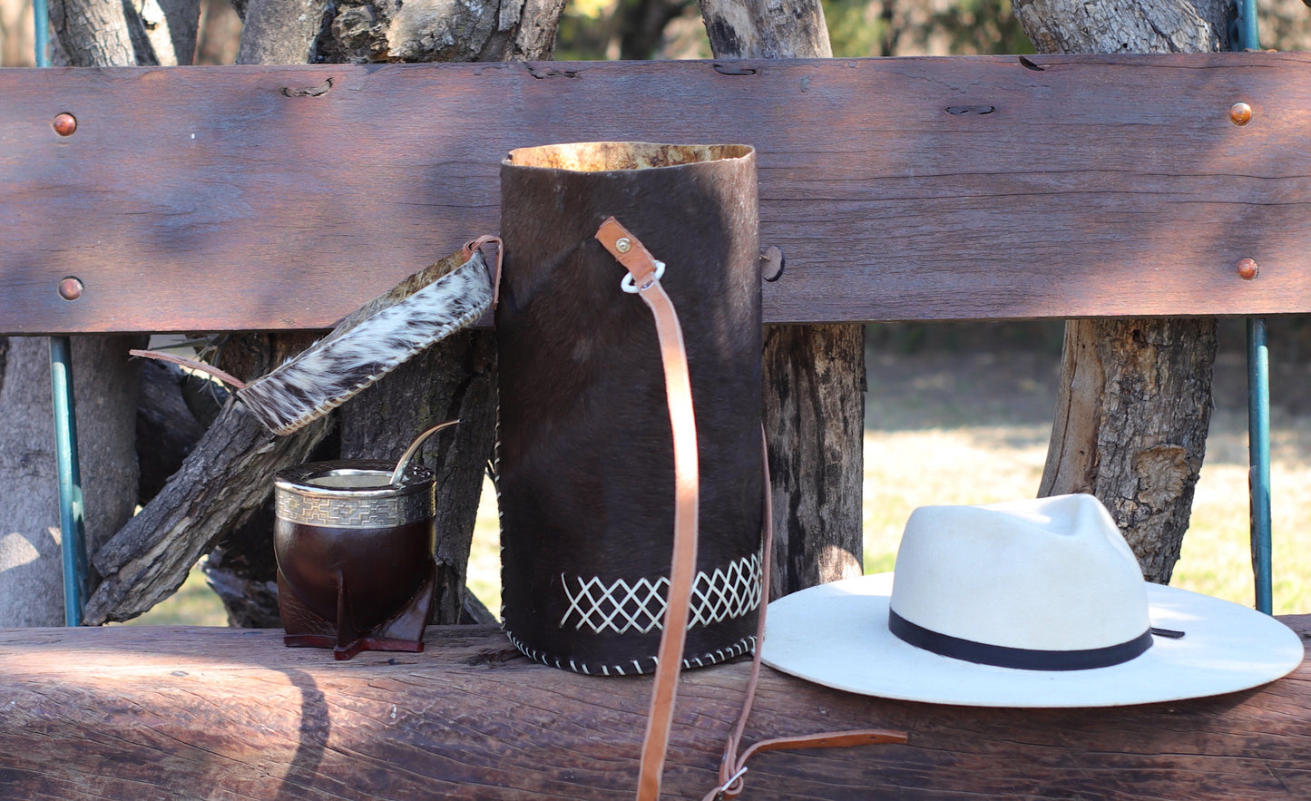 Porta equipo matero de cuero natural hecho a mano cocido con tientos.