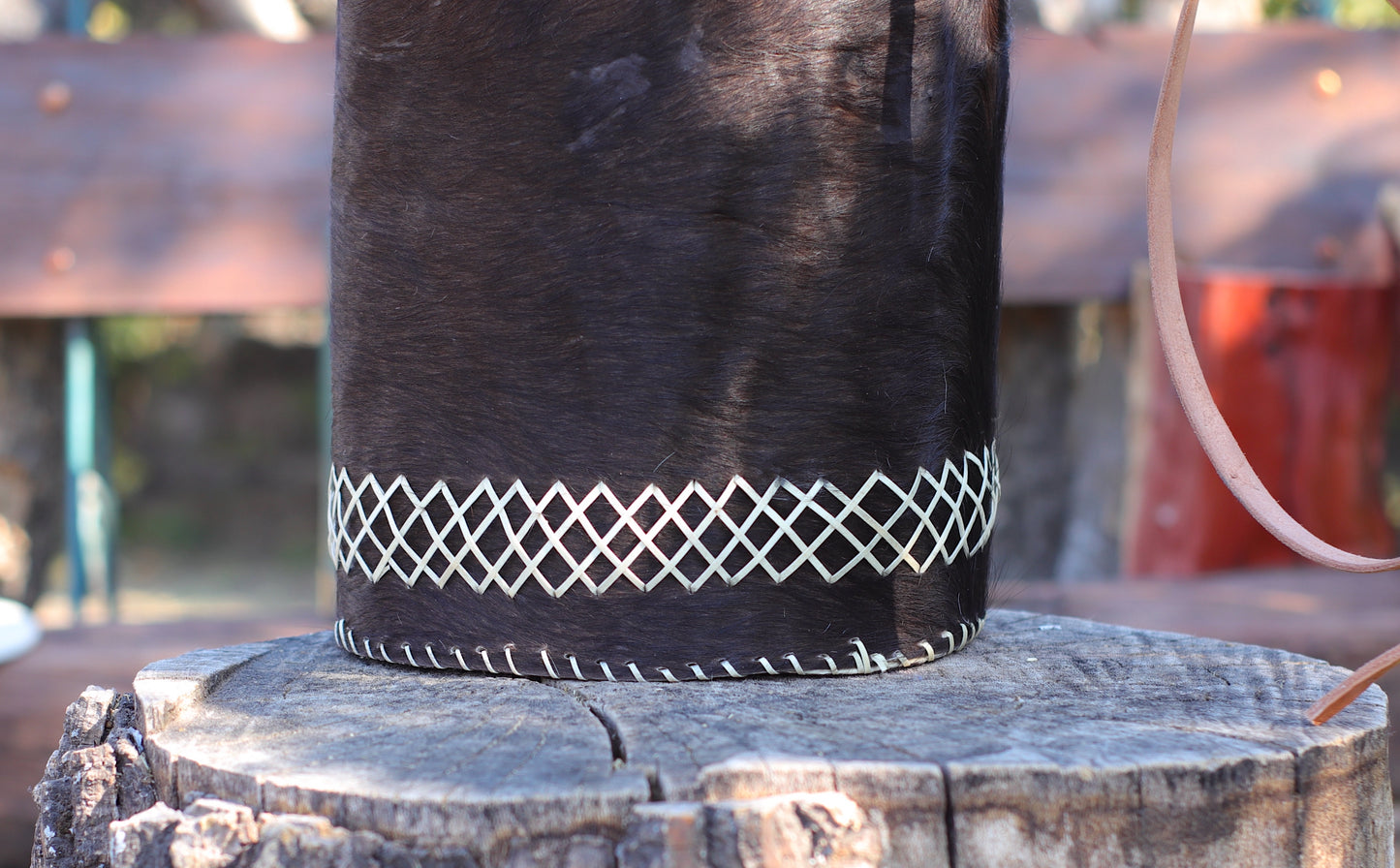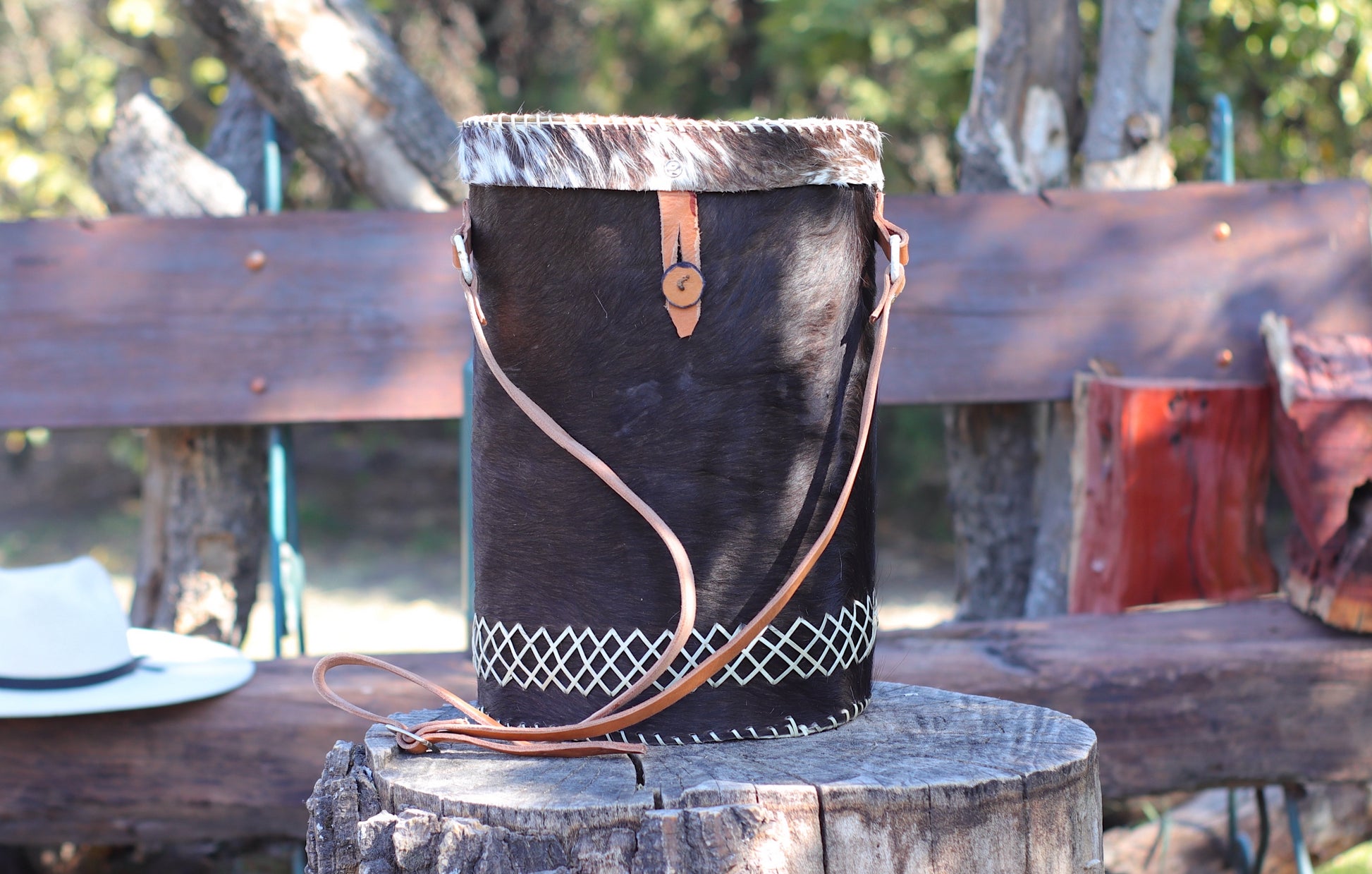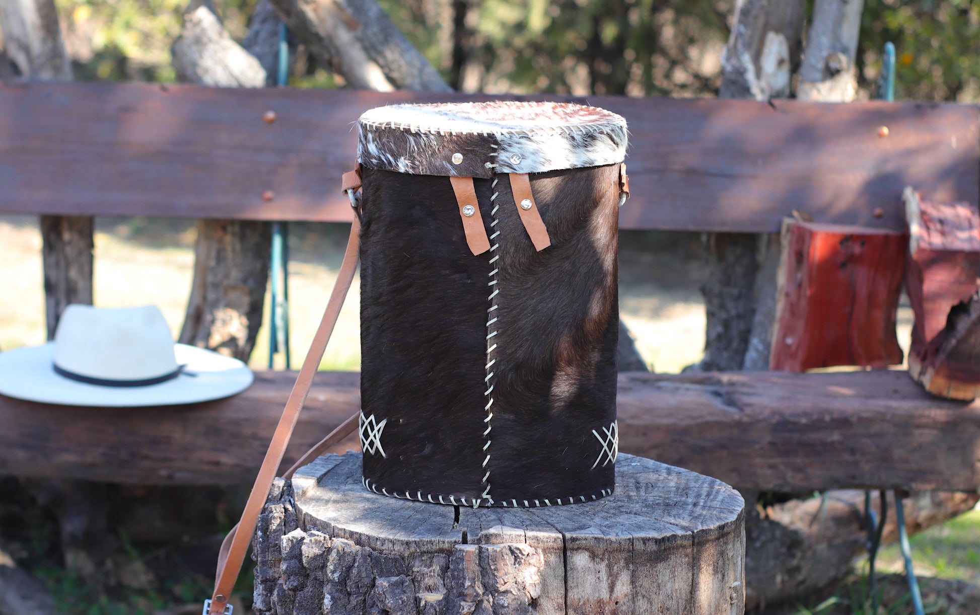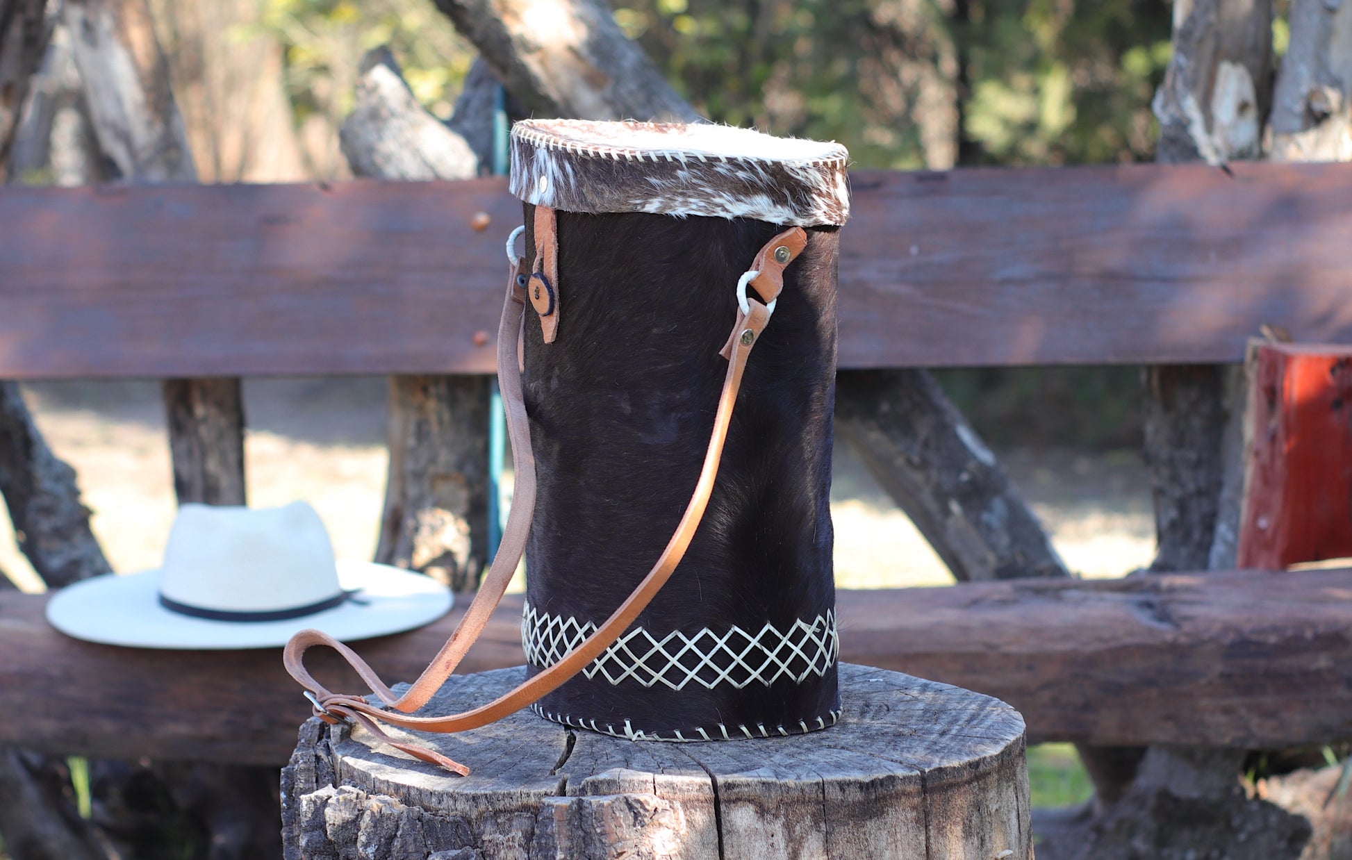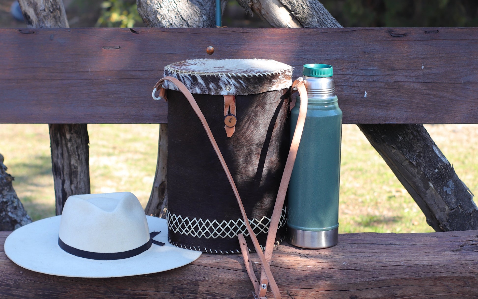Porta equipo matero de cuero natural hecho a mano cocido con tientos.