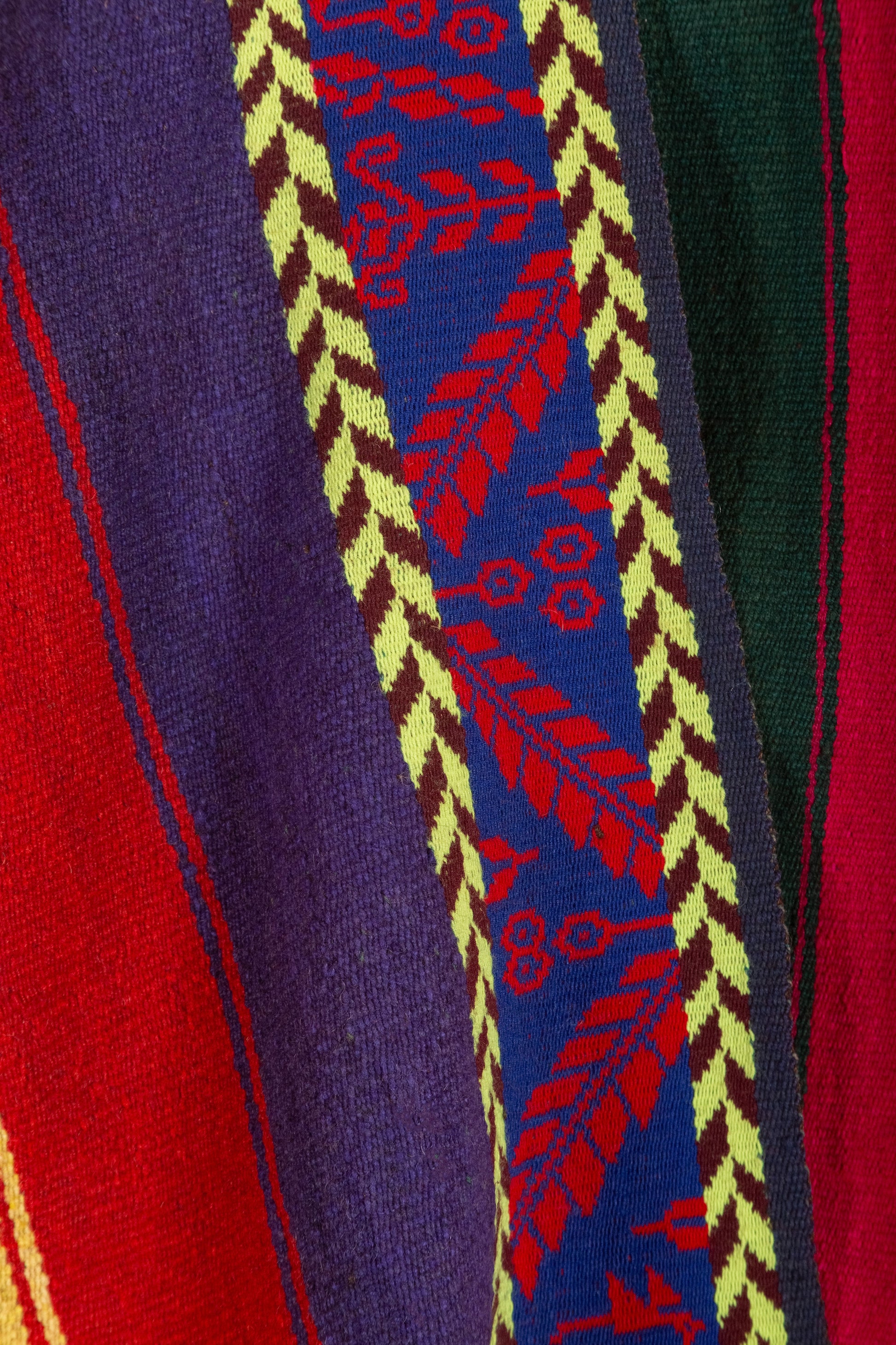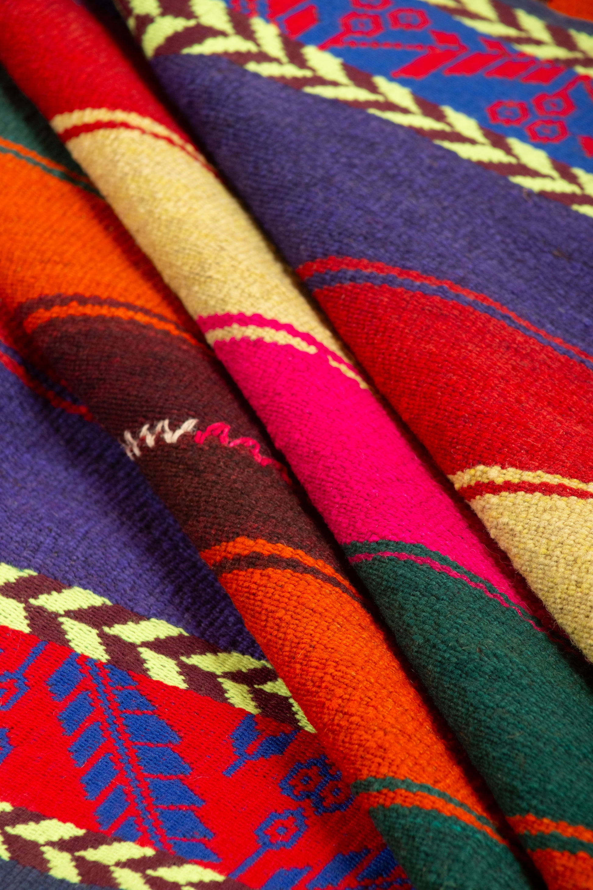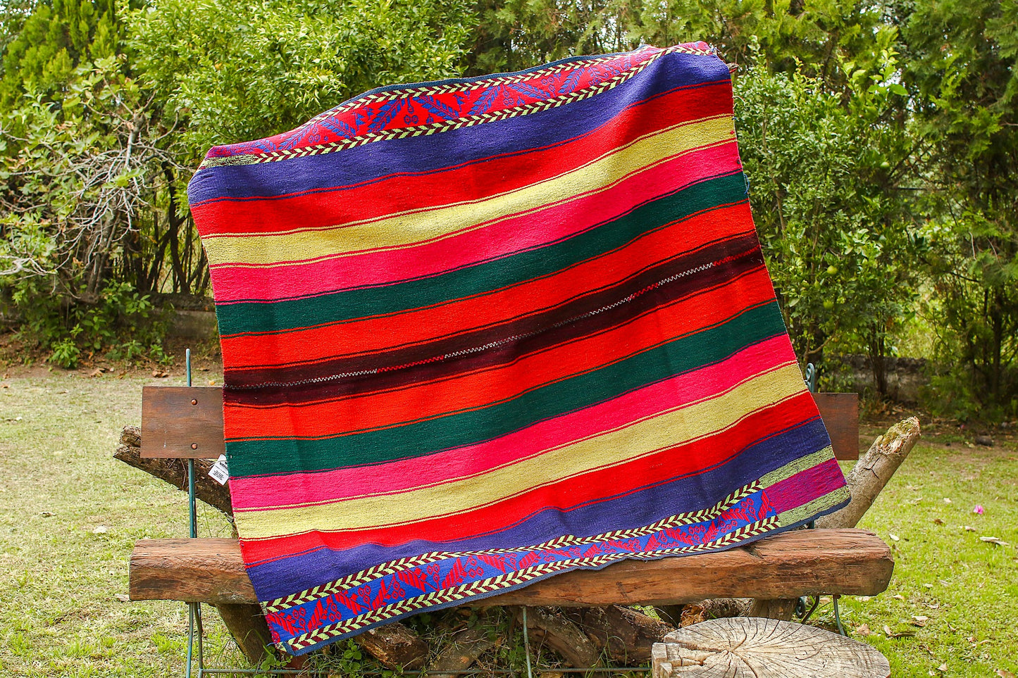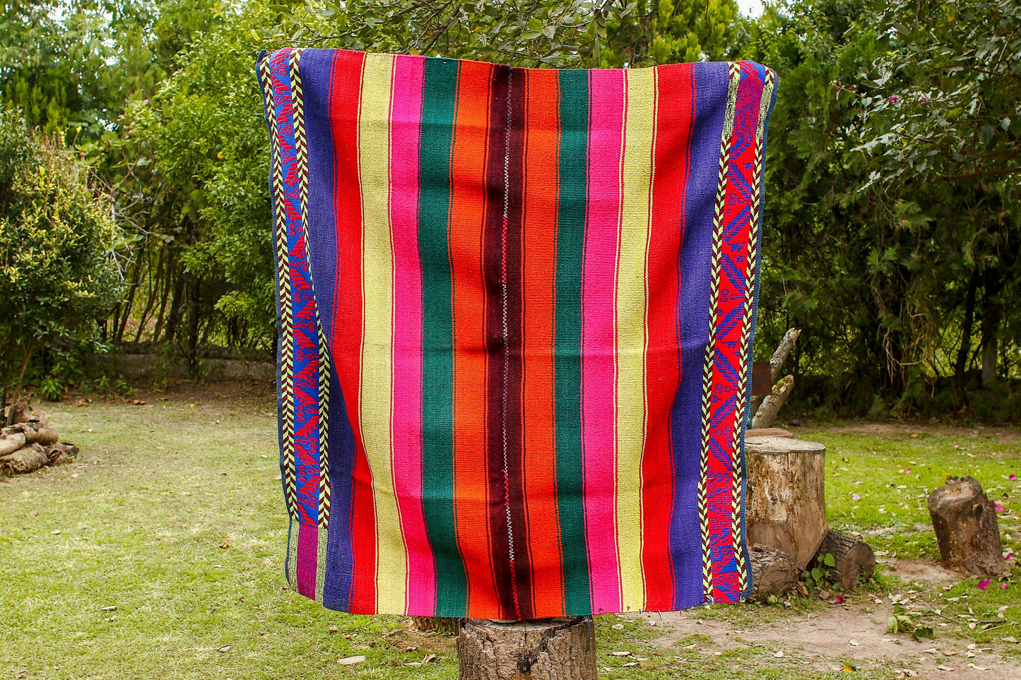 Fue realizado con técnicas de tejido ancestral y artesanal desde la esquila, hilado en rueca hasta la confección en telar antiguo
