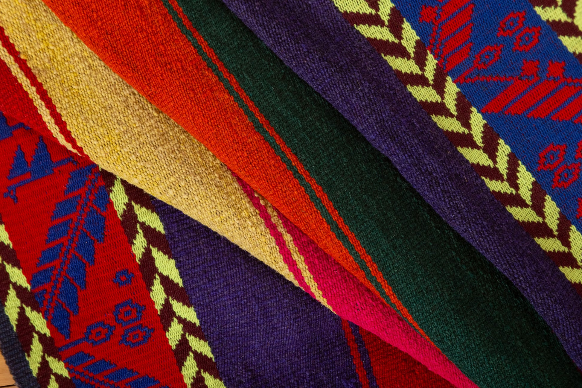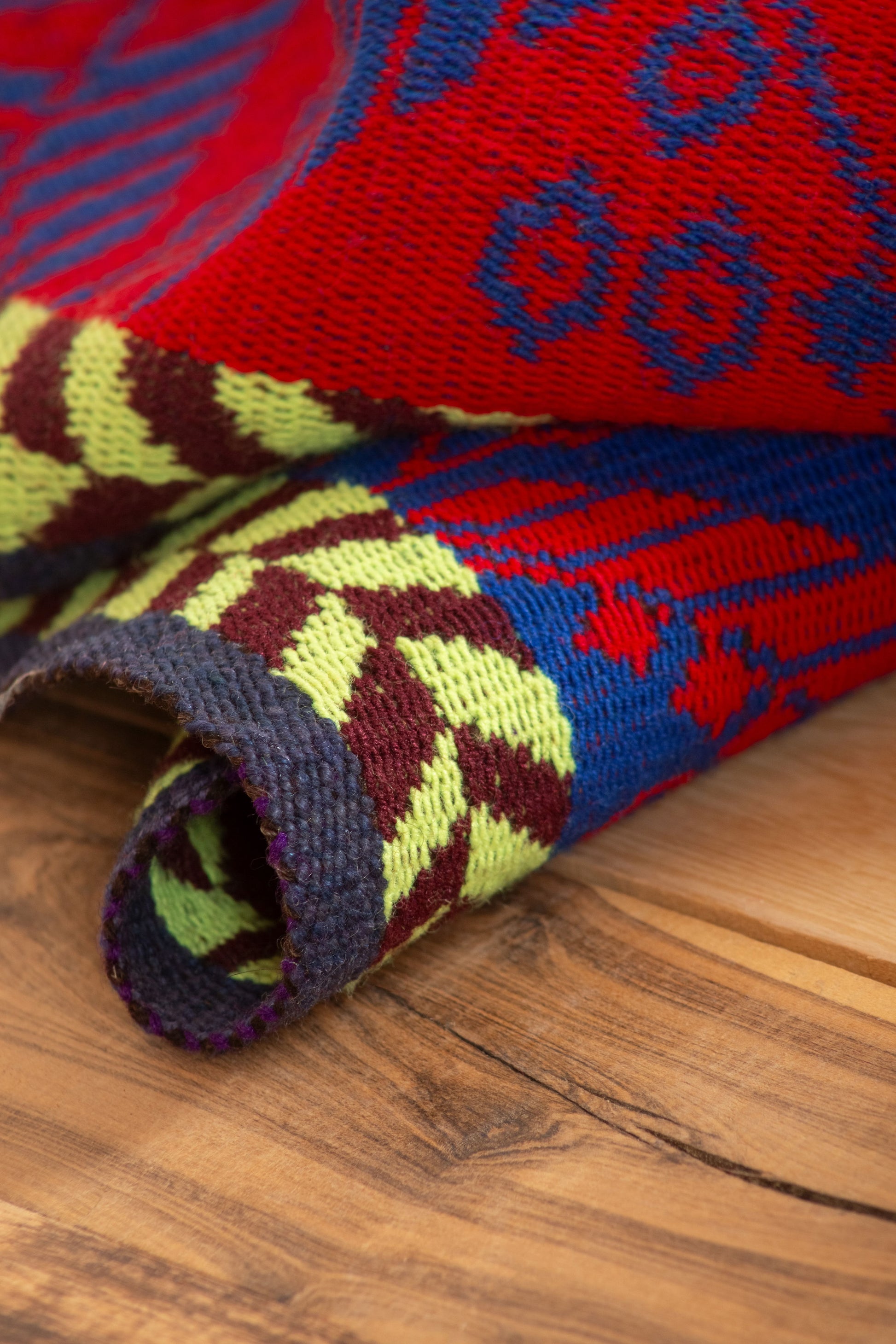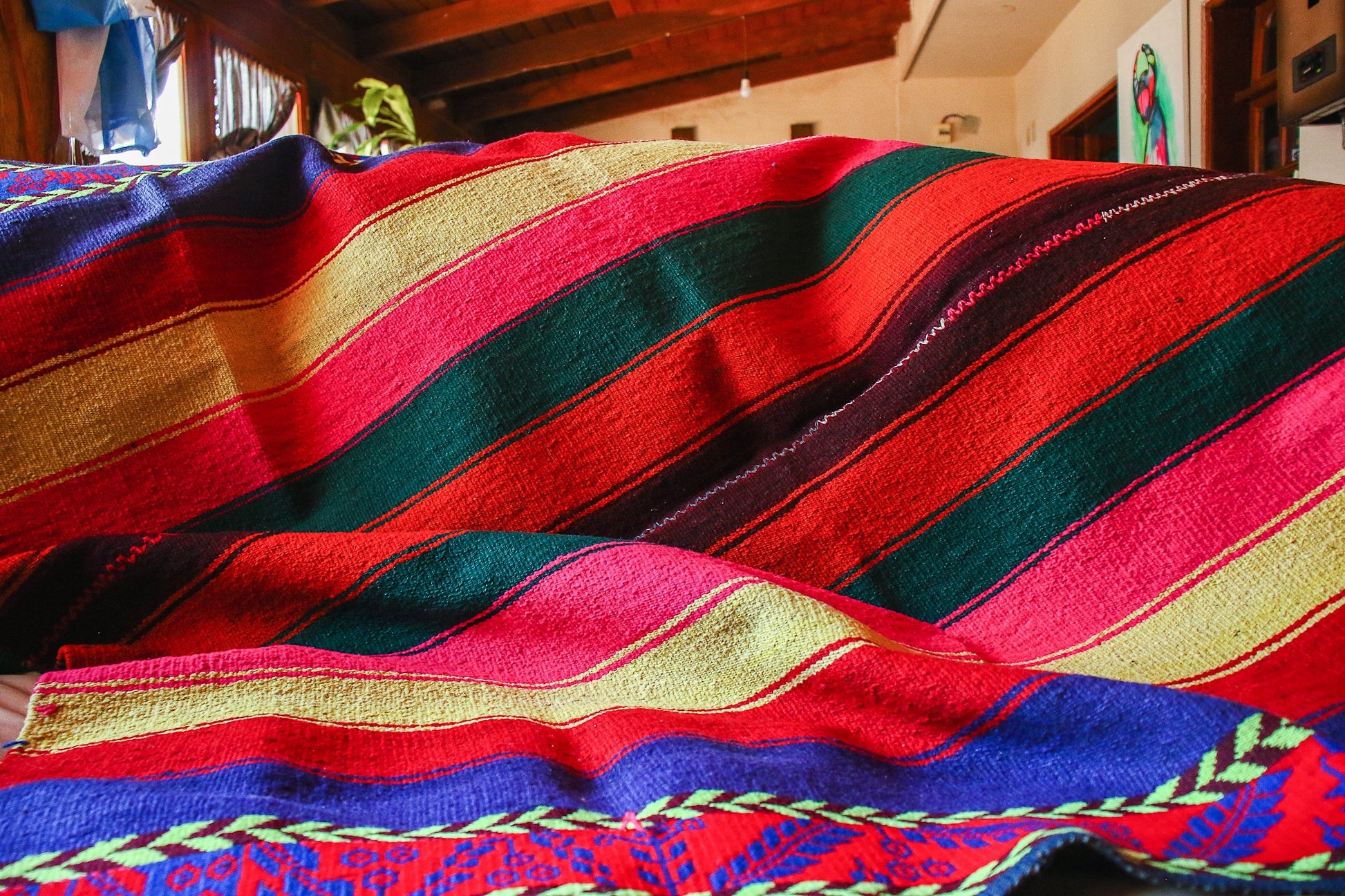 EL TEJIDO de la confección es anverso y reverso, tejido que es muy difícil y especial en un telar por lo cual, de un lado las guardas son predominantemente Rojas y en el anverso predomina el tono Azul
