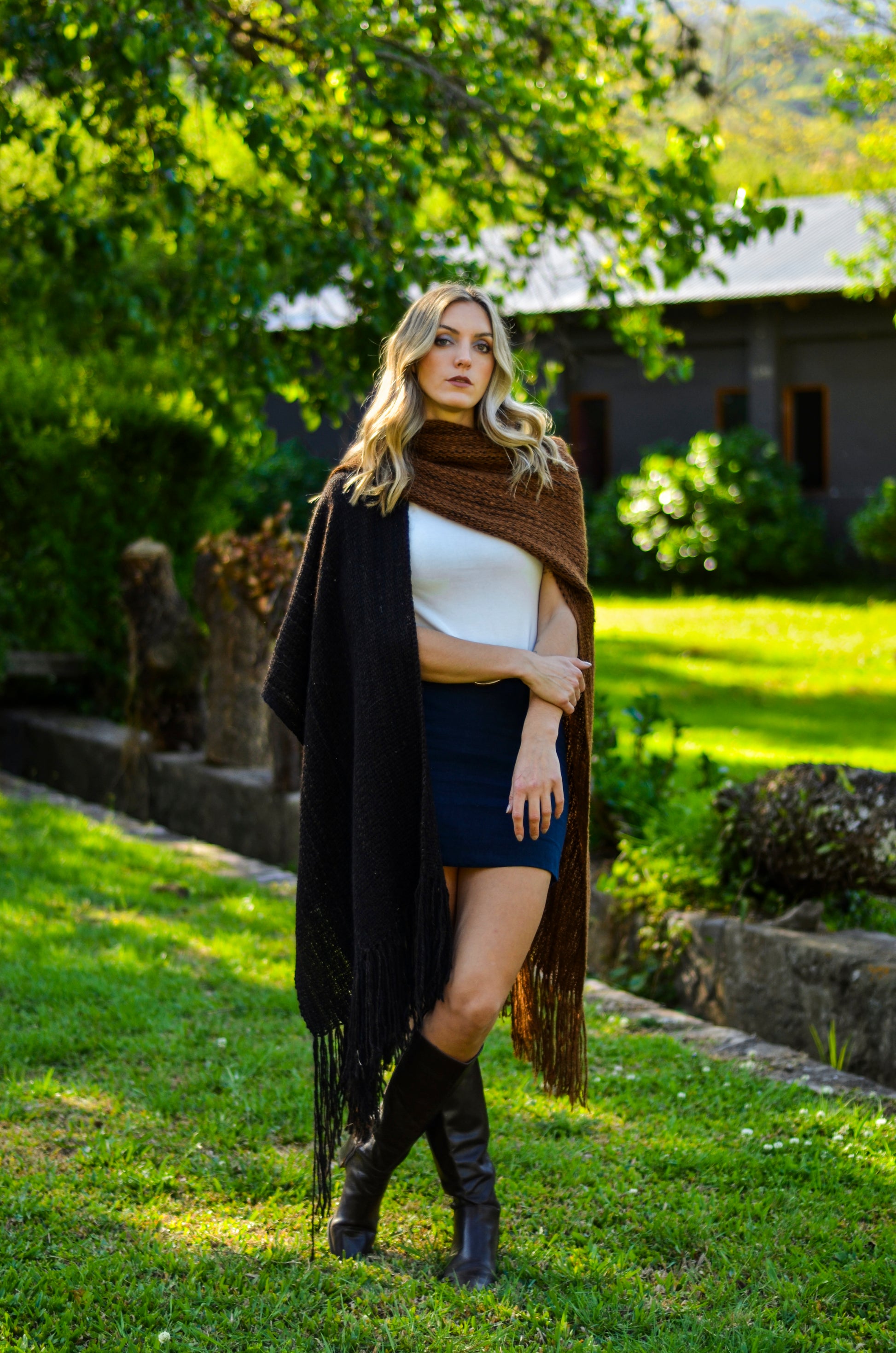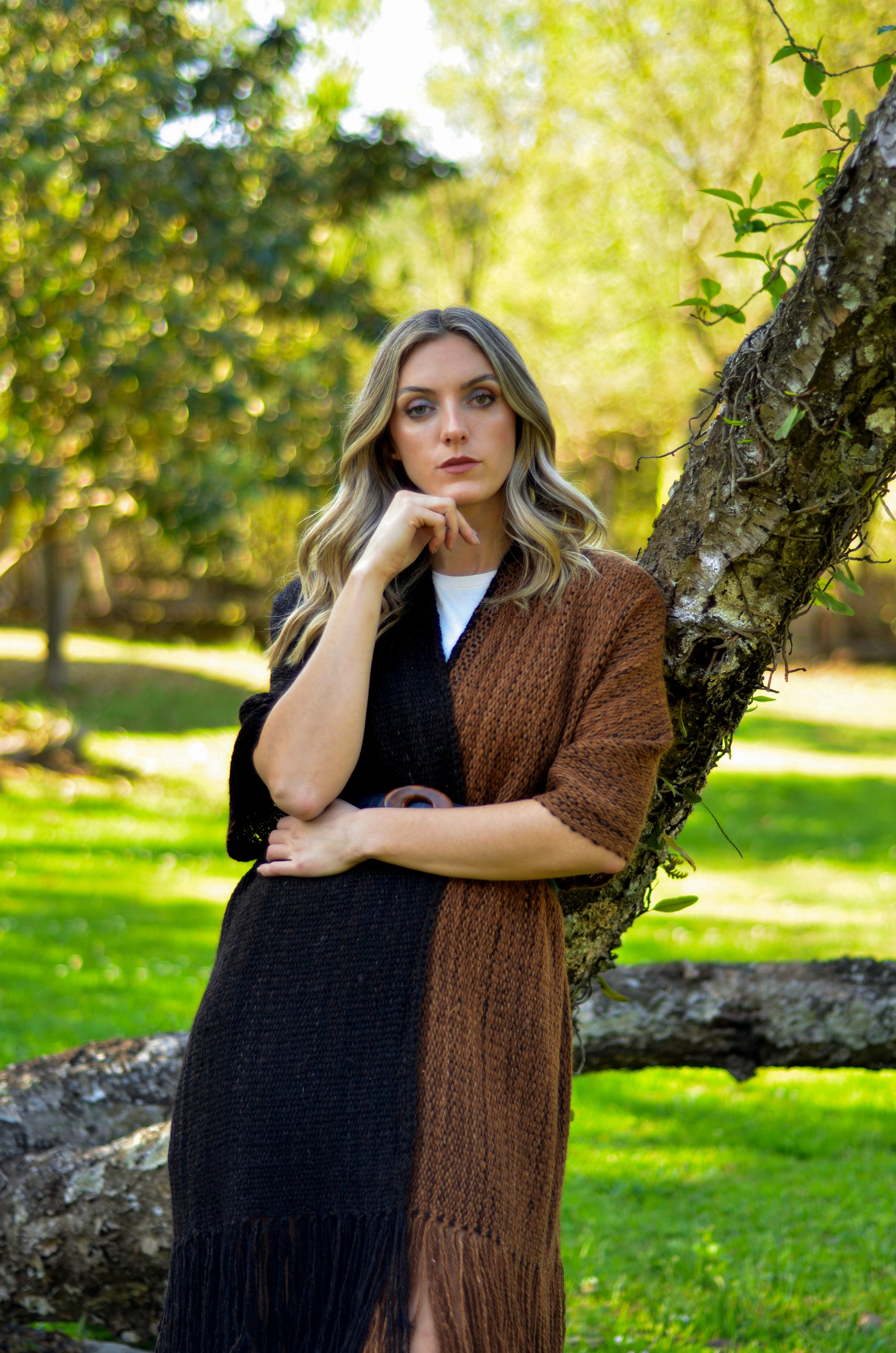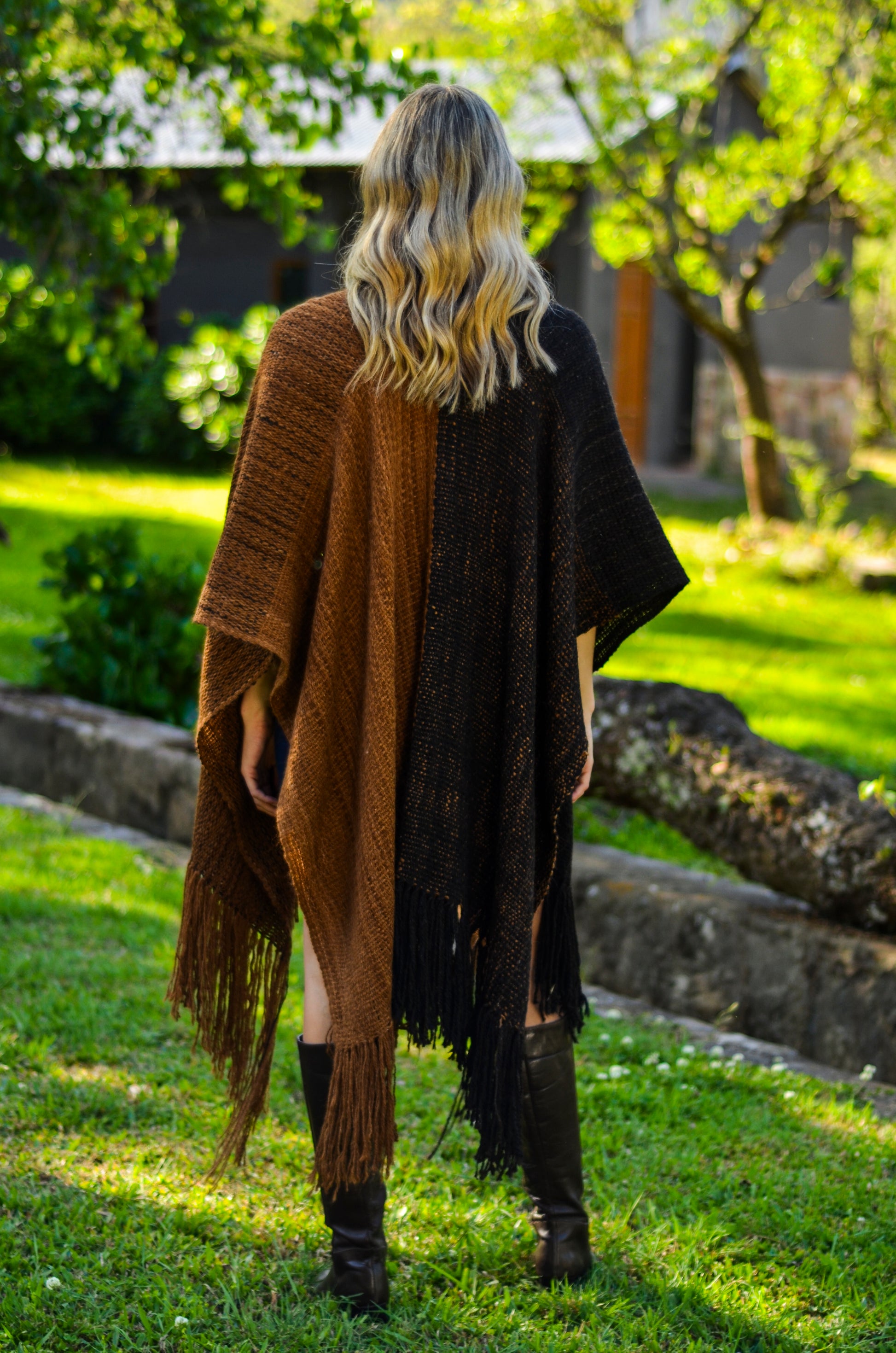 Pehuen es parte de la Colección "Runa" es una ruana hecha en telar rústico con hilos de llama baby en colores chocolate y negro, naturales de la fibra.
