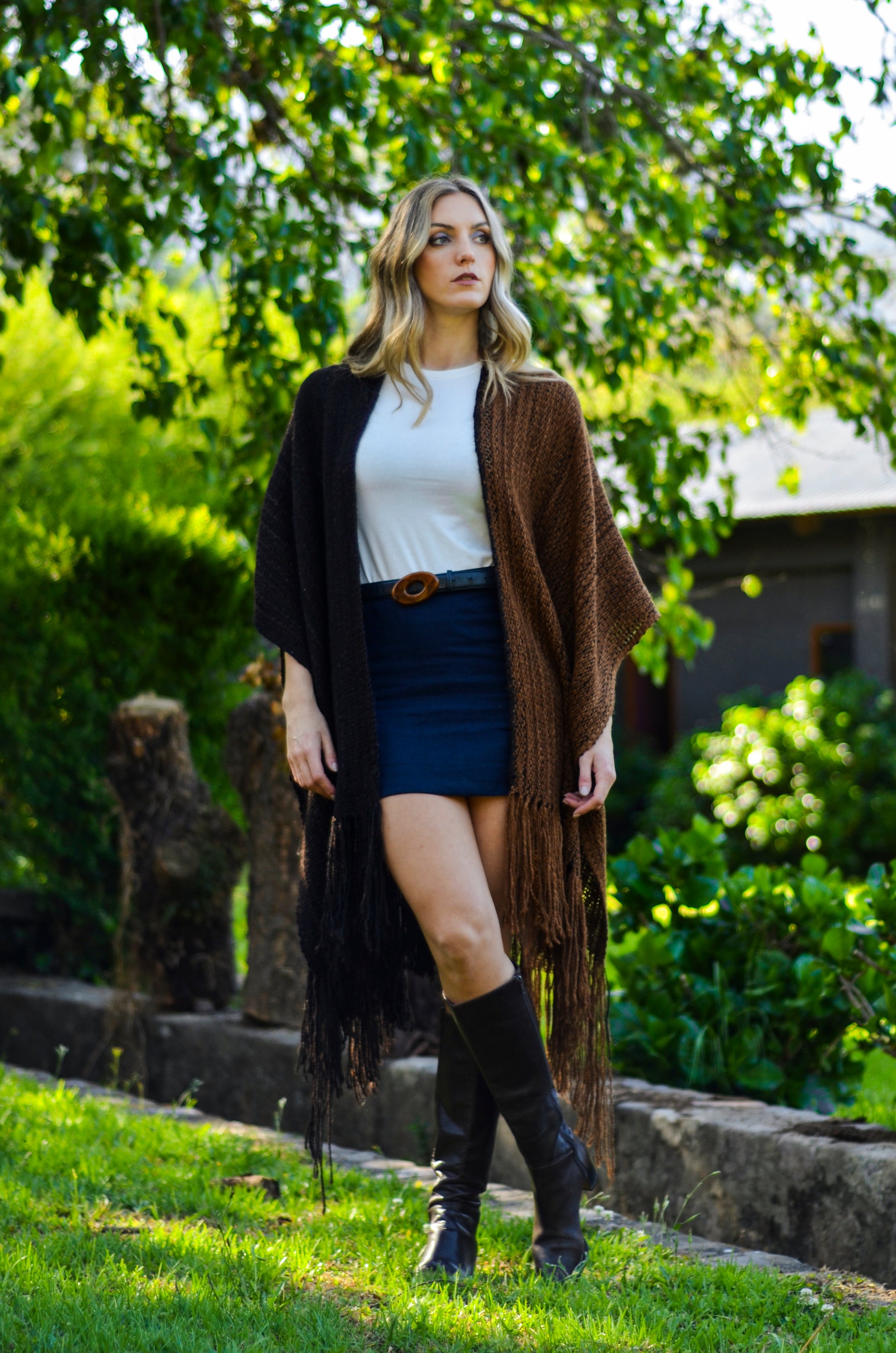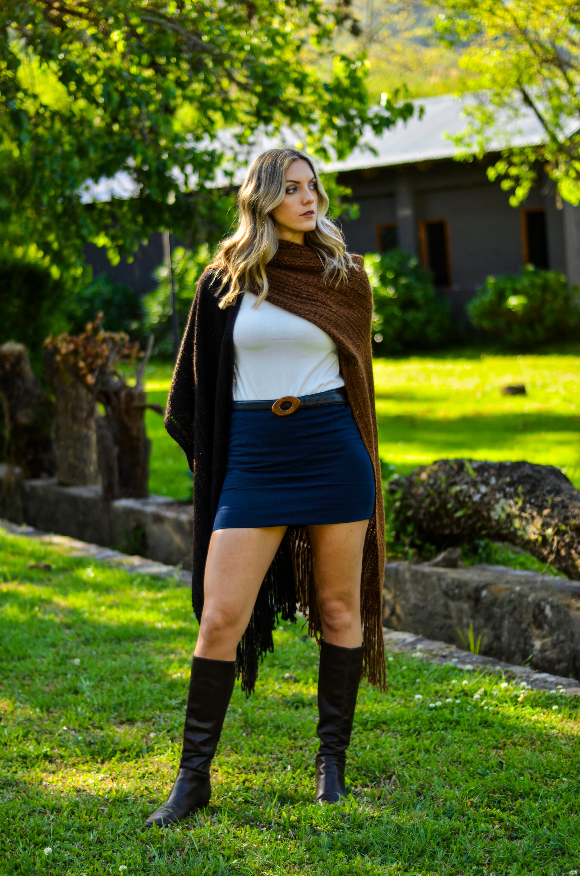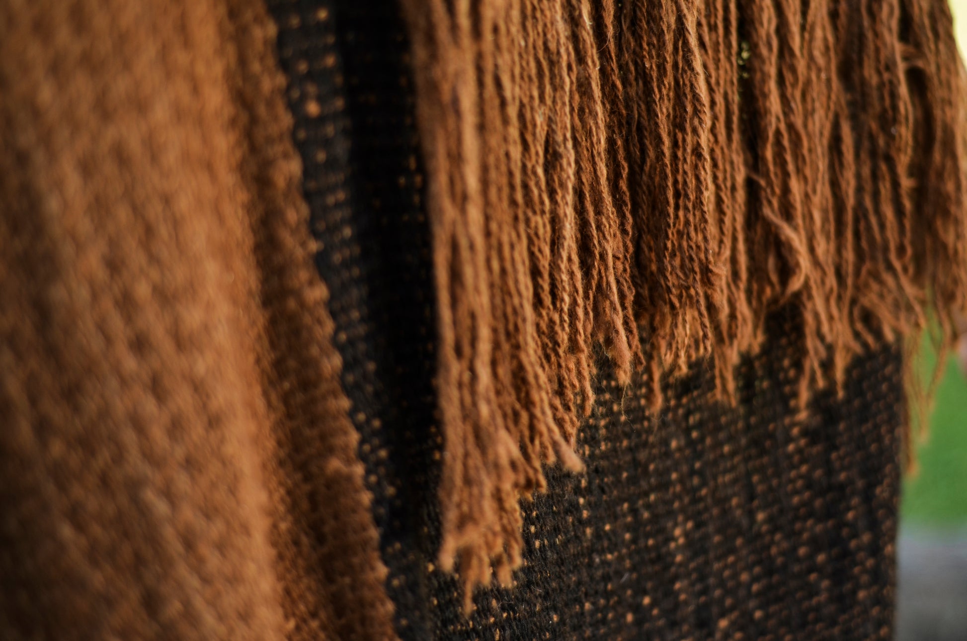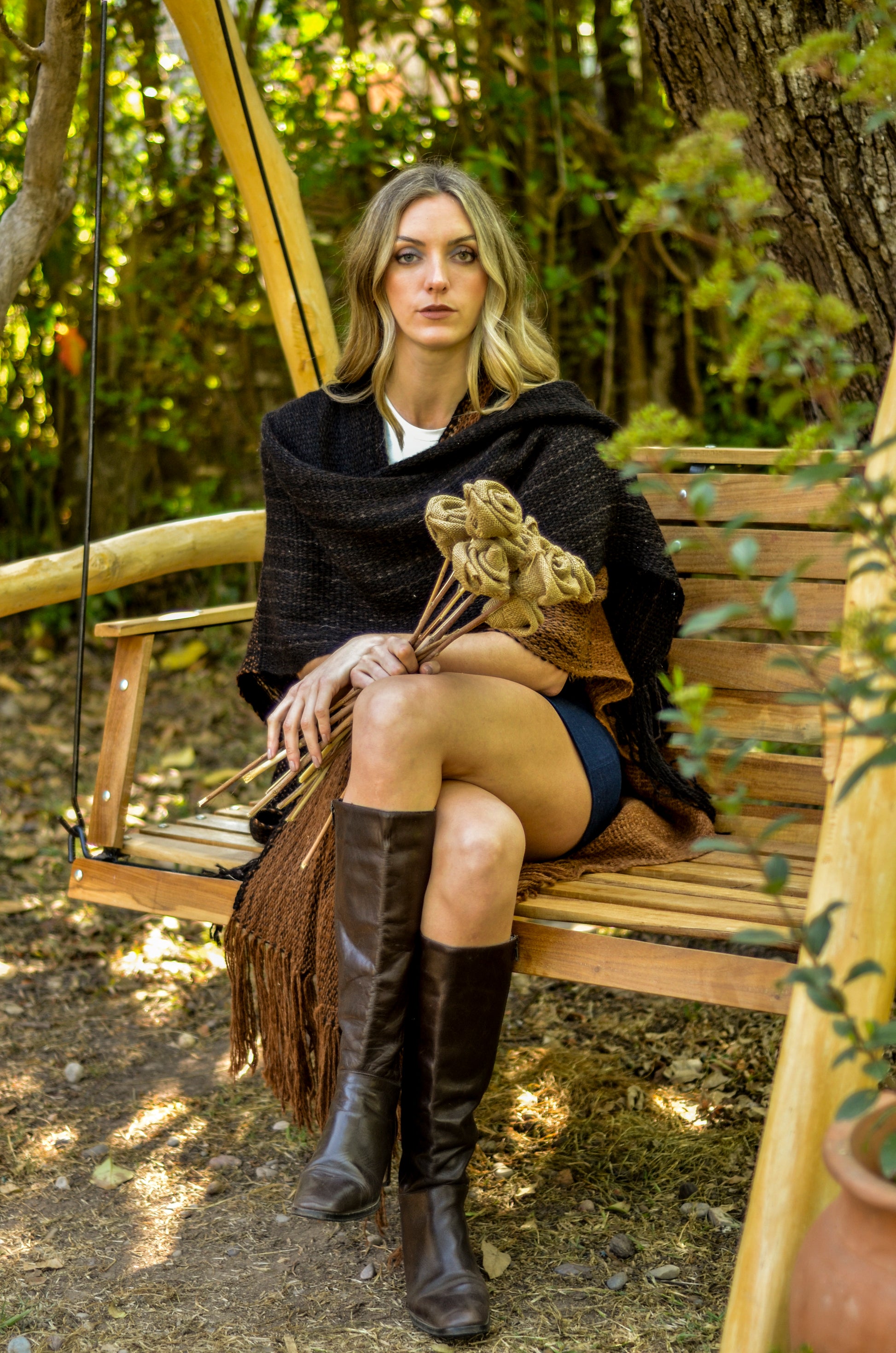 Pehuen es parte de la Colección "Runa" es una ruana hecha en telar rústico con hilos de llama baby en colores chocolate y negro, naturales de la fibra.