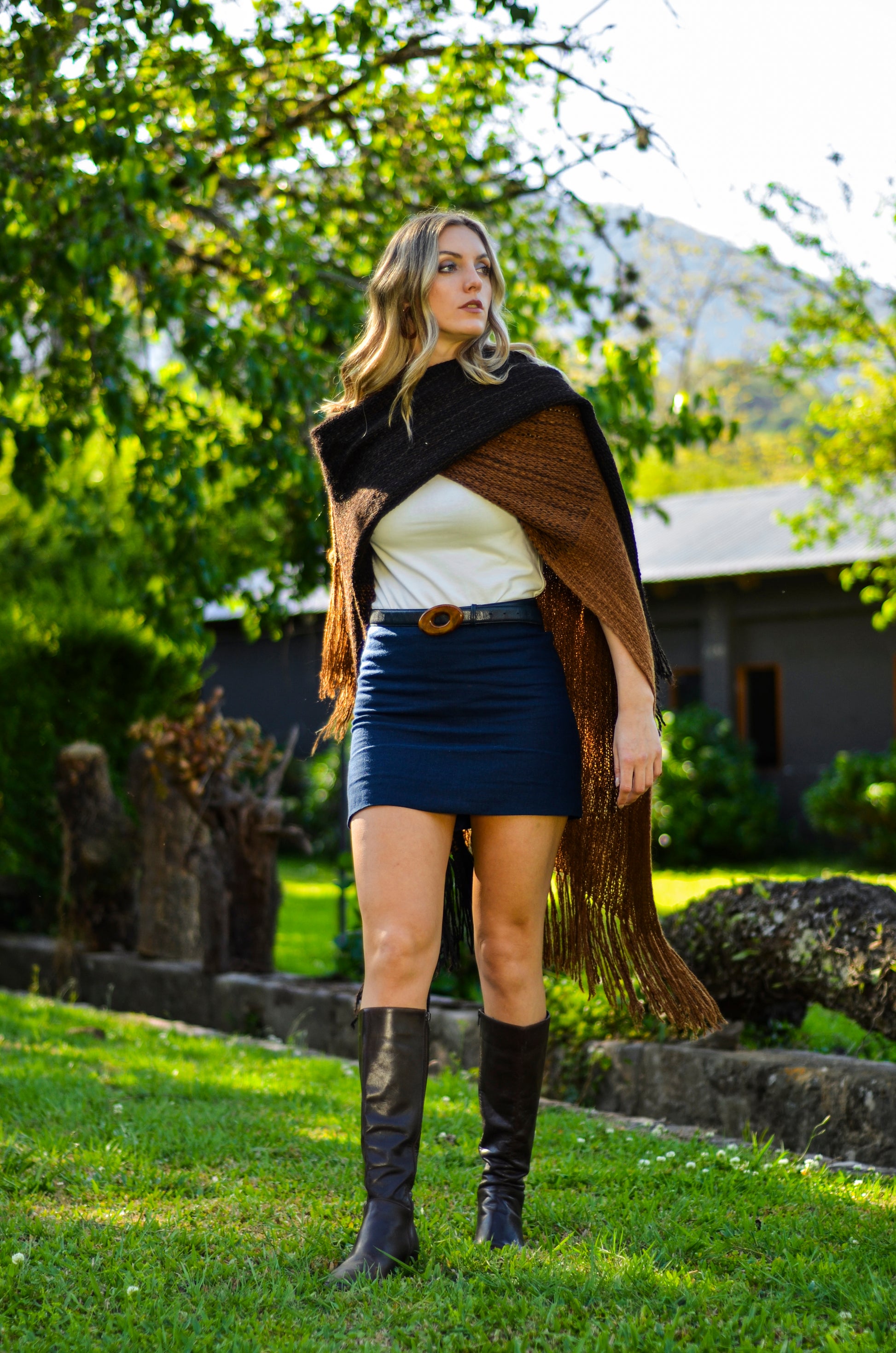 Esta ruana es confeccionada con fibra hilada del lomo de la llama, por eso es suave y liviana pero con las propiedades de abrigo natural
