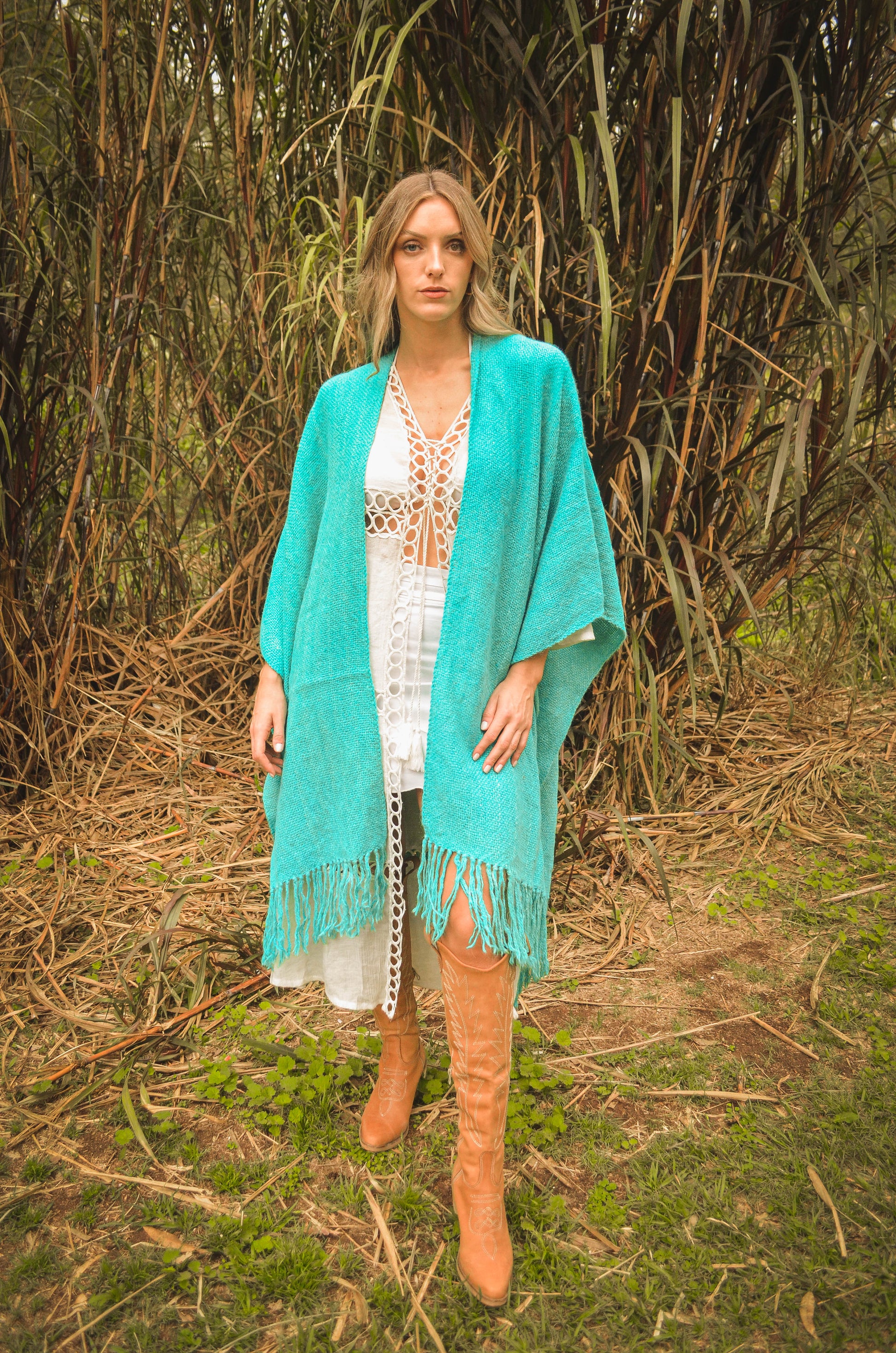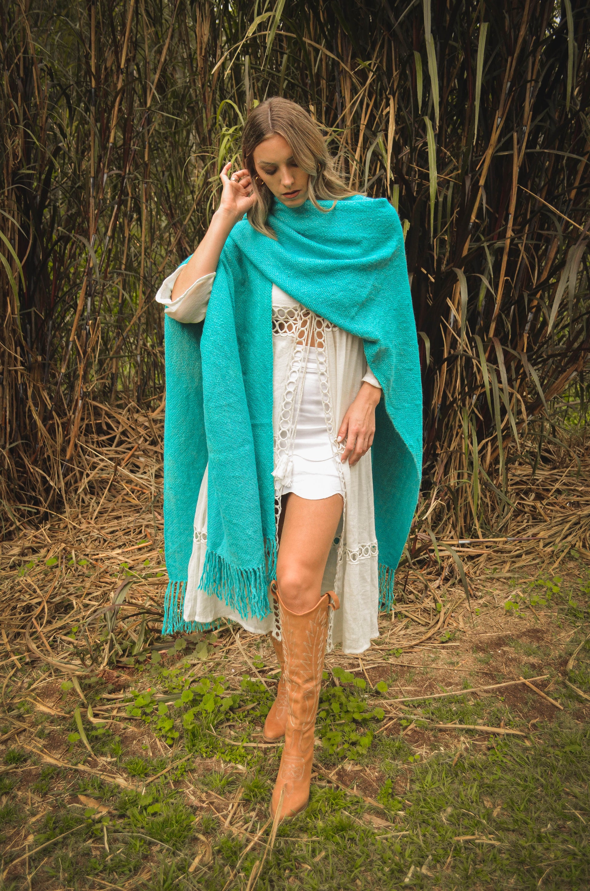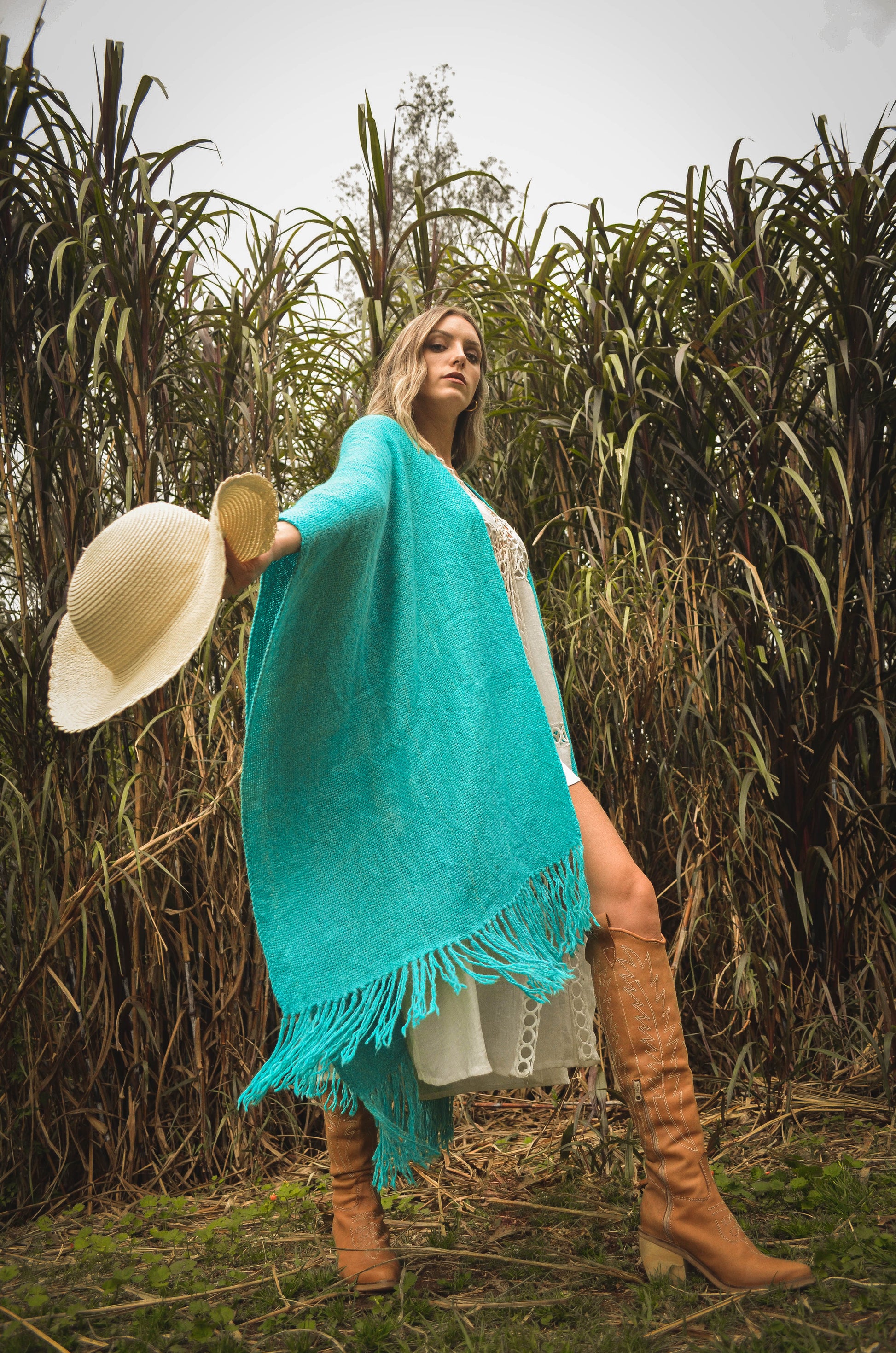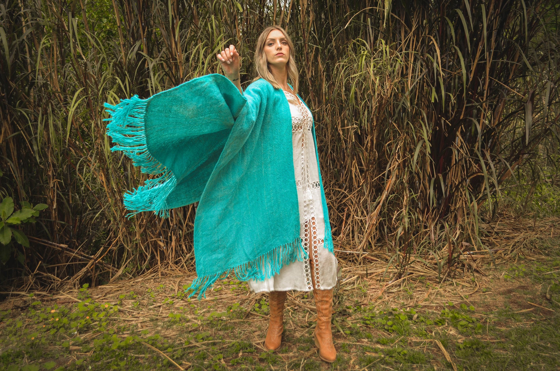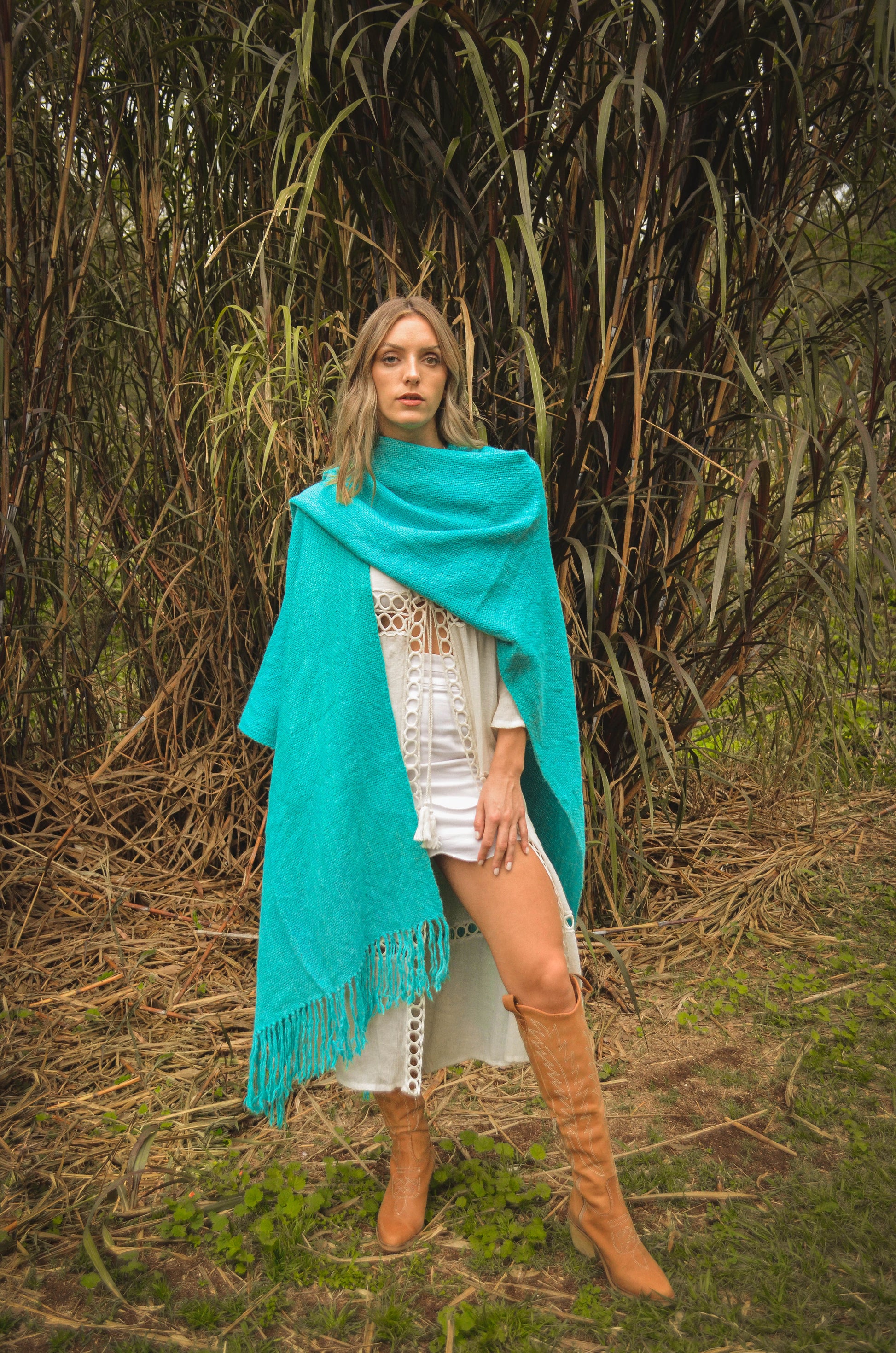 Ruana "Aymara" está hecha a mano en telar rústico con hilos de llama baby.