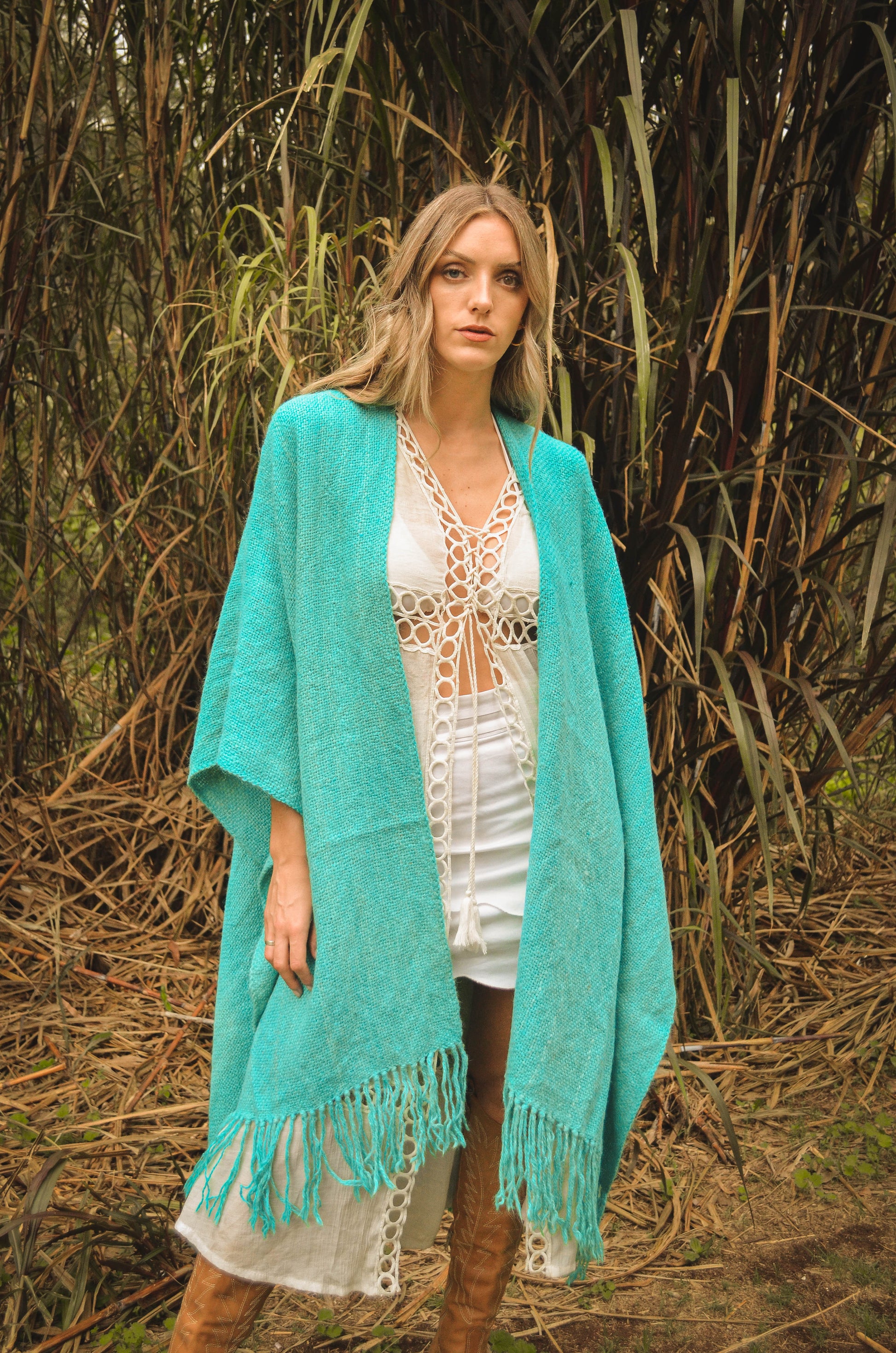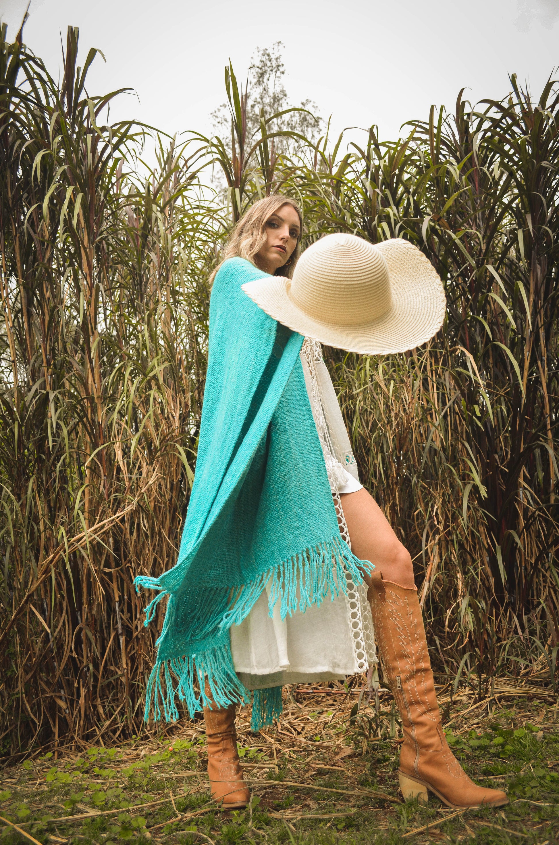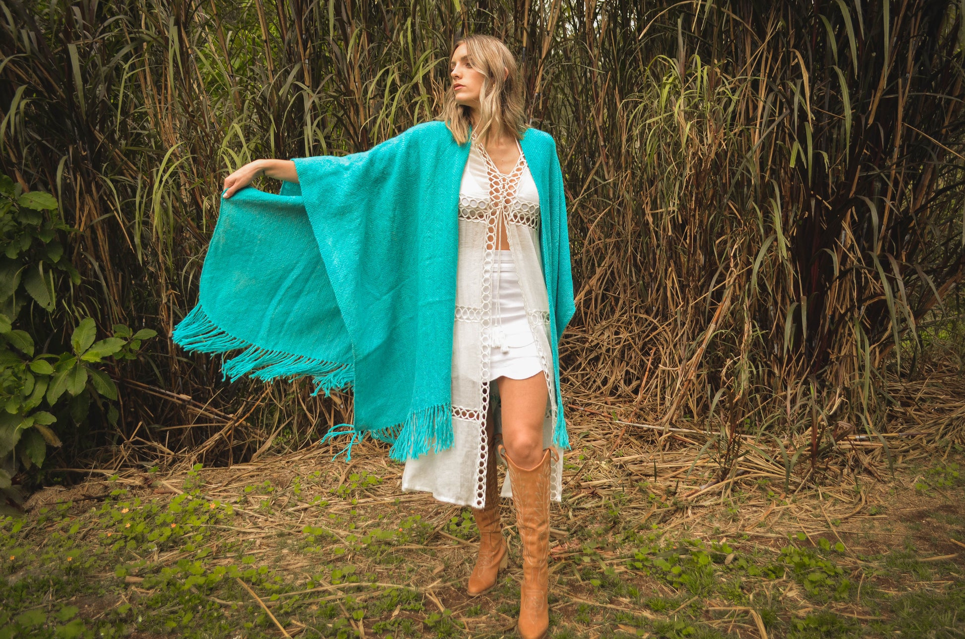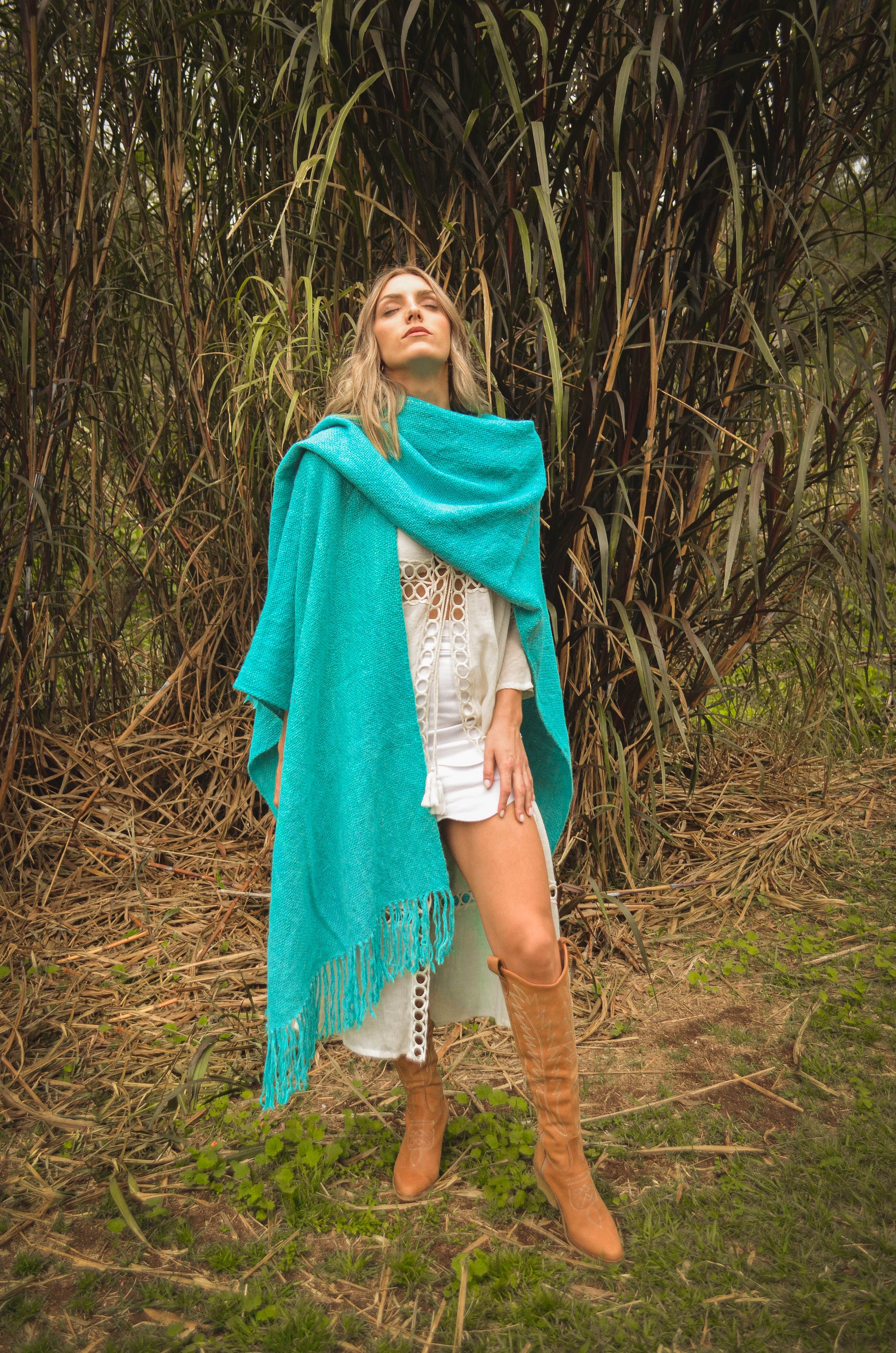 Ruana "Aymara" está hecha a mano en telar rústico con hilos de llama baby.