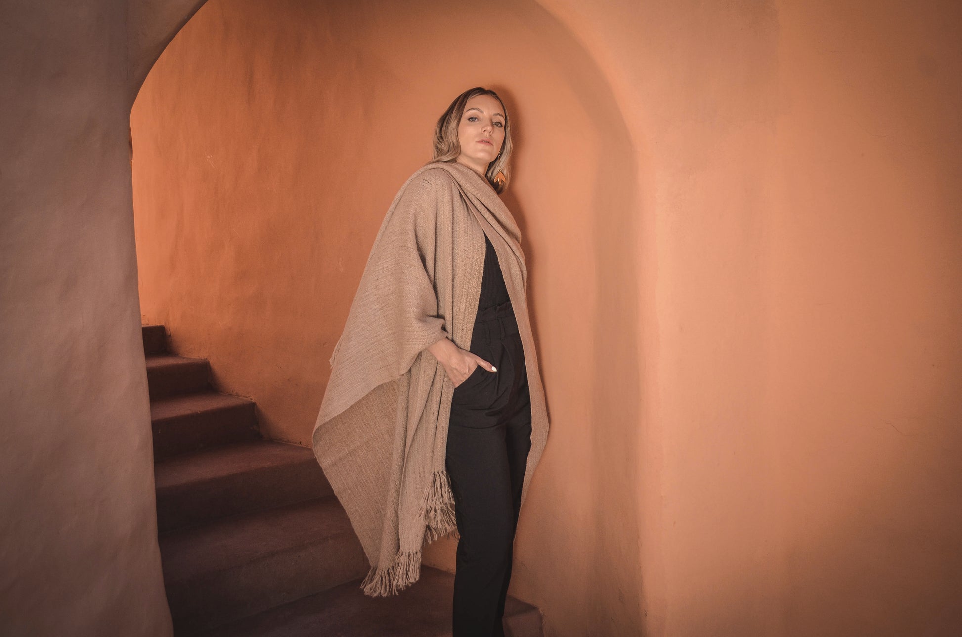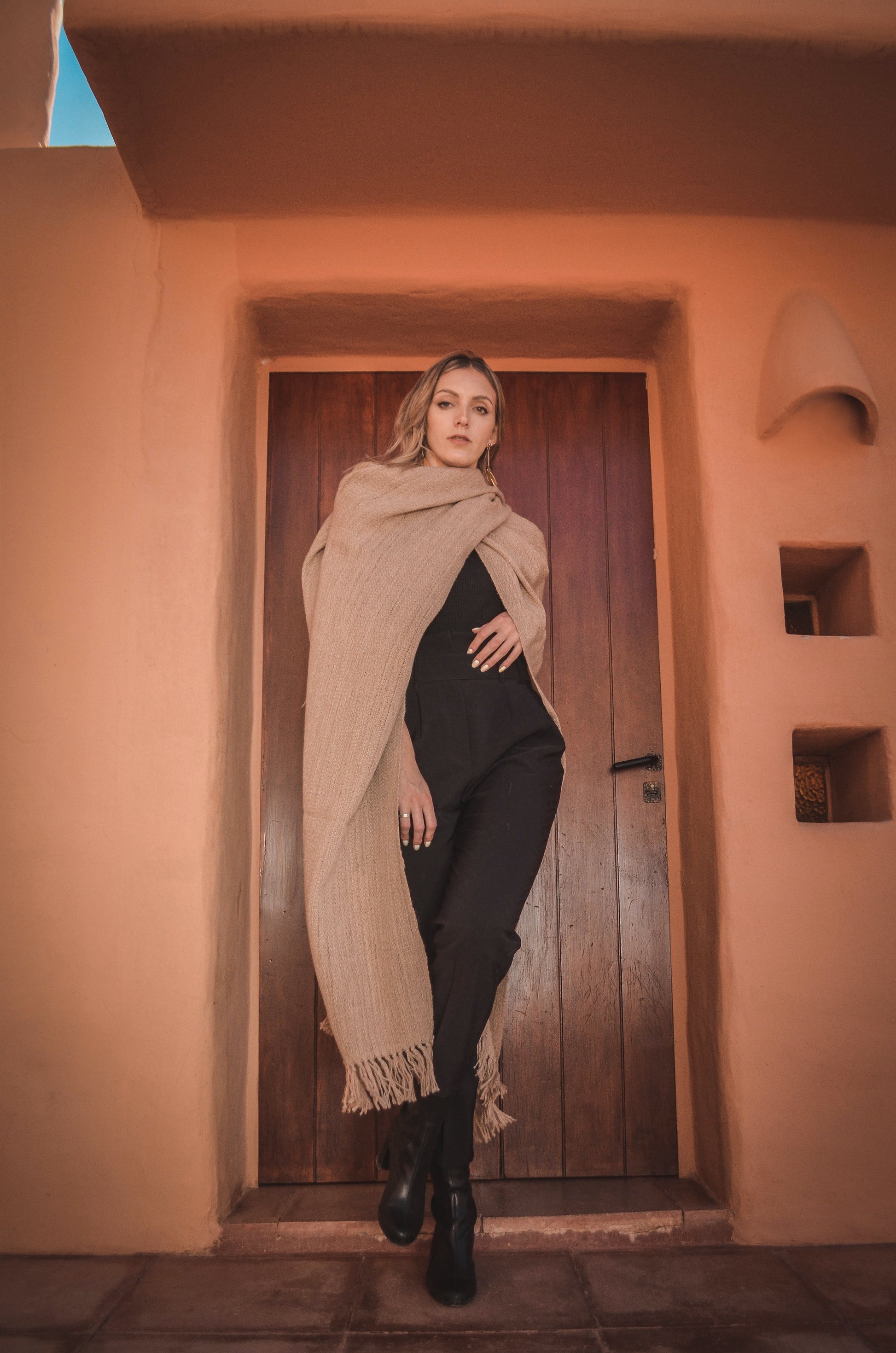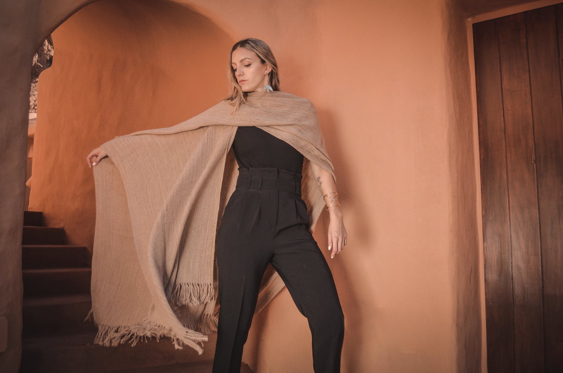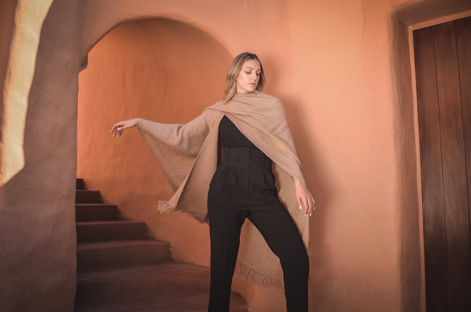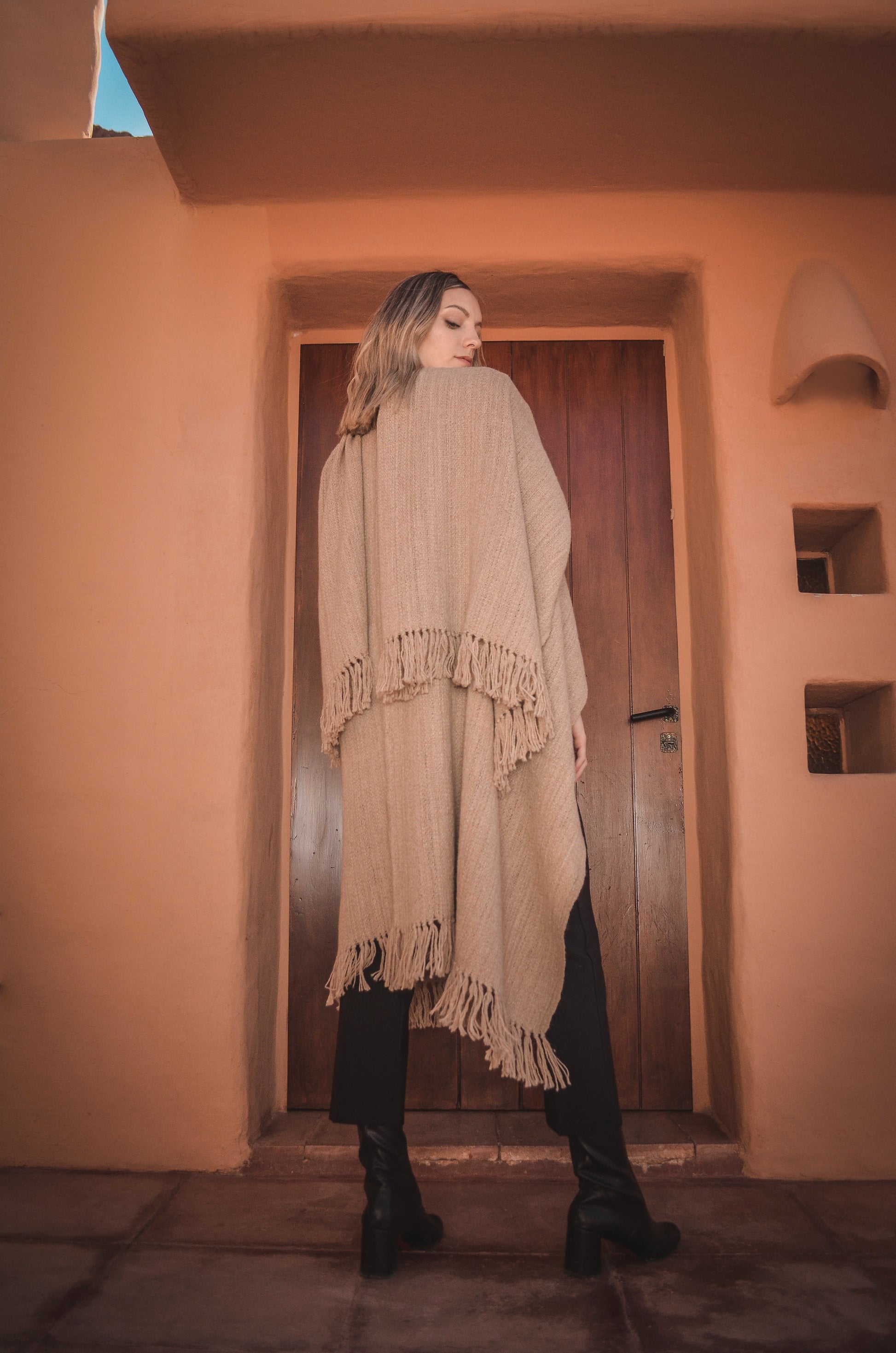 Ruana "Cafayate" es parte de la Colección "Runa" está hecha en telar a mano con hilos de lana de llama baby color camel.