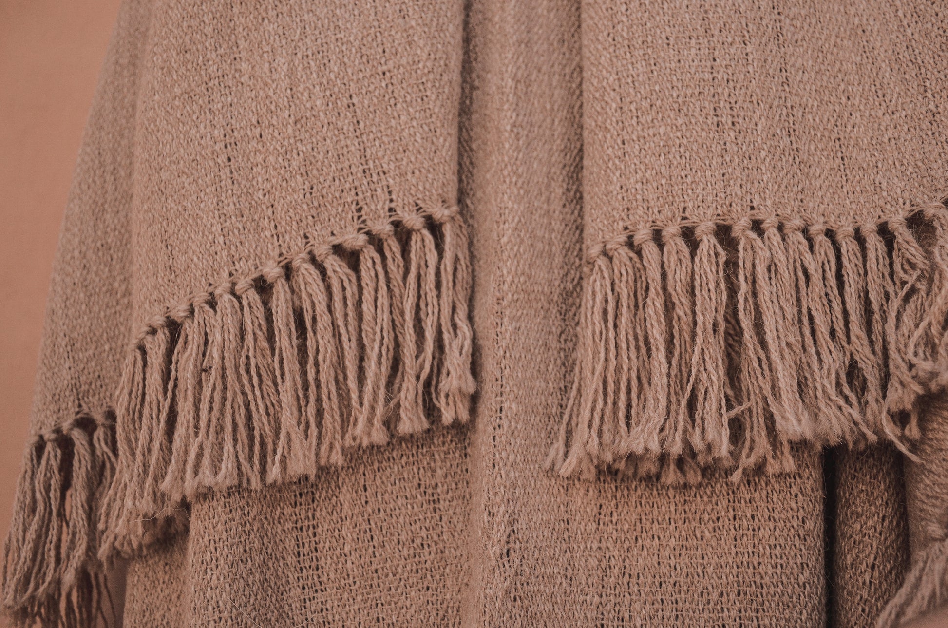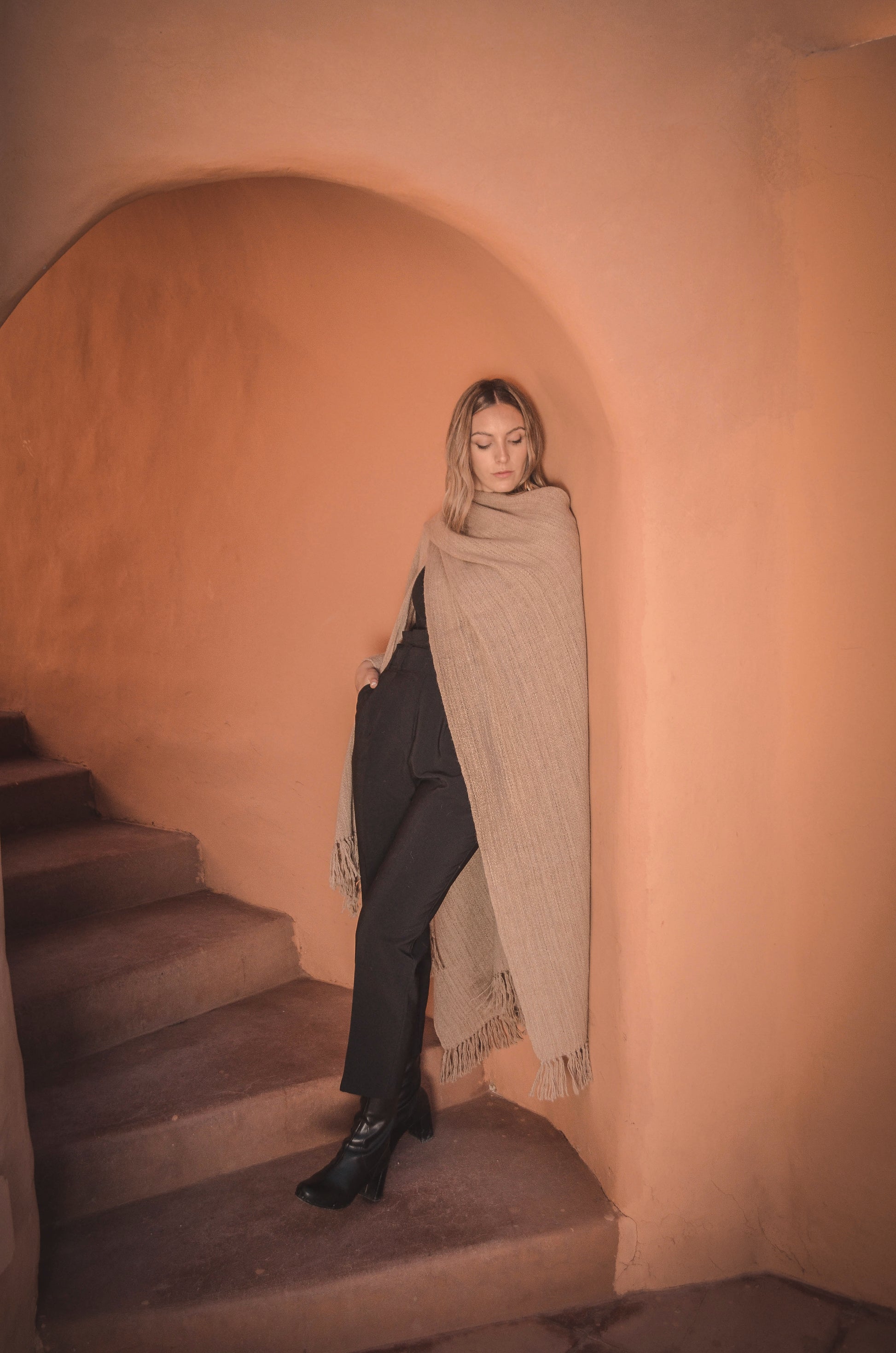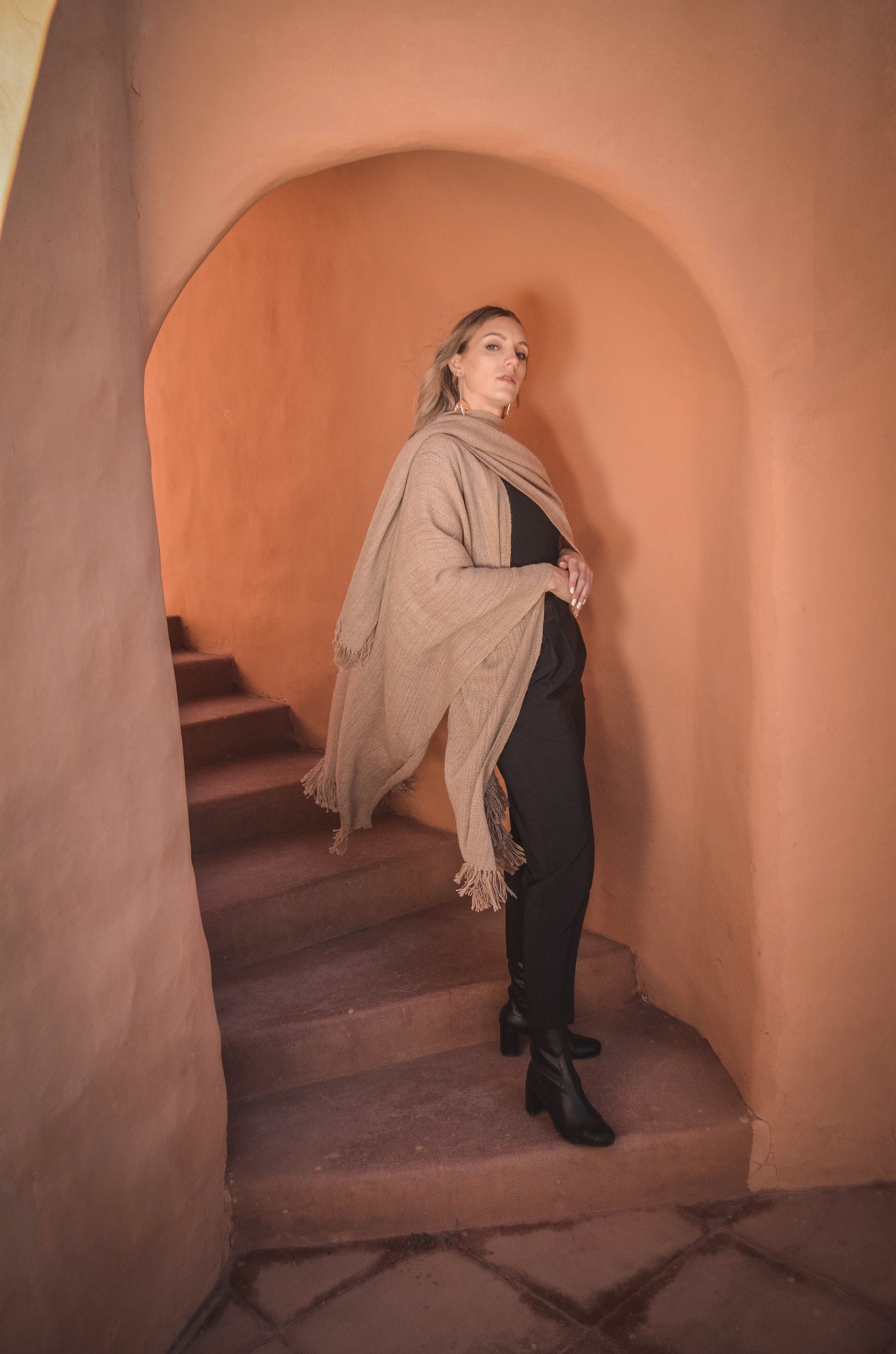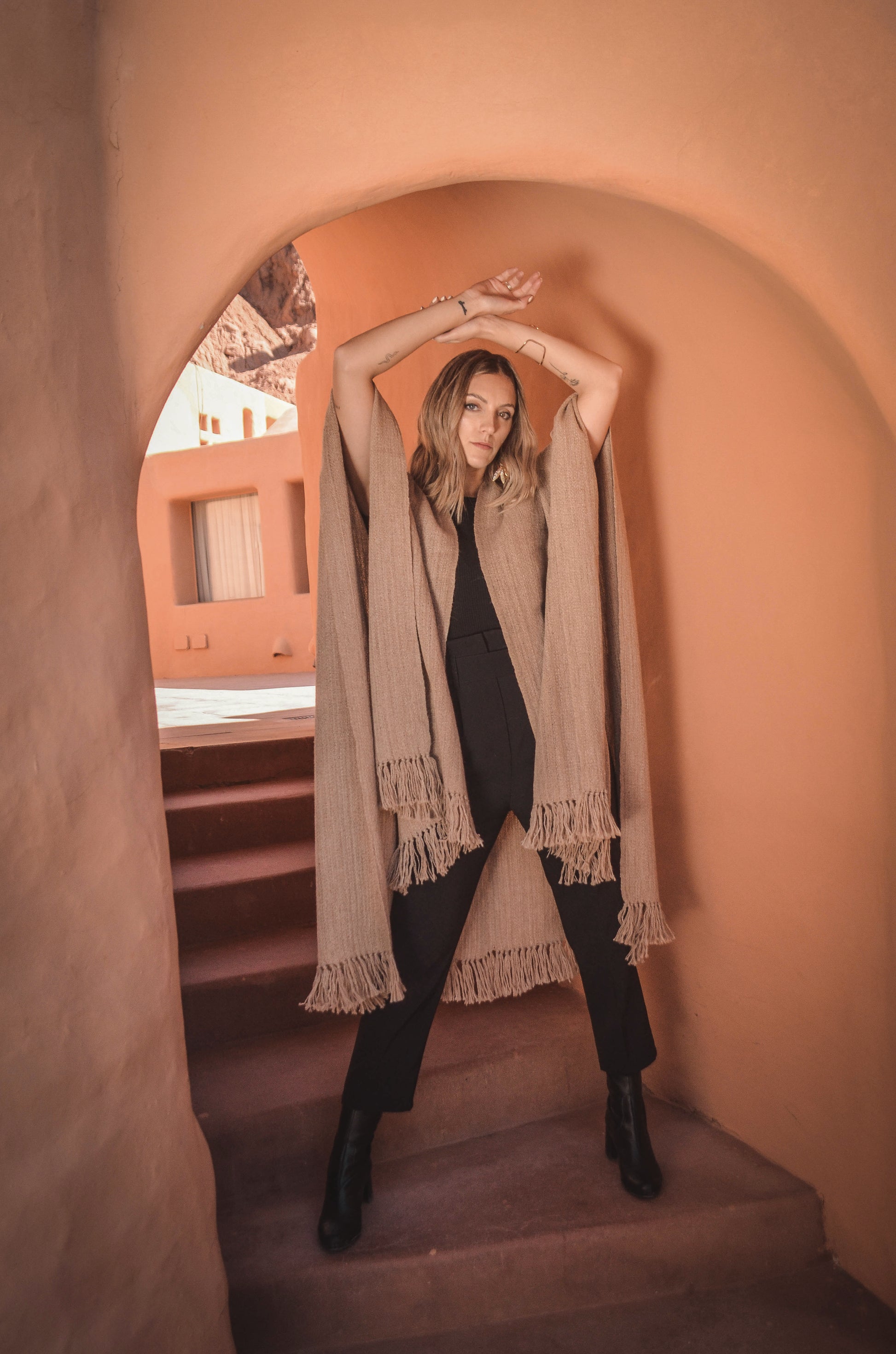 Ruana "Cafayate" es parte de la Colección "Runa" está hecha en telar a mano con hilos de lana de llama baby color camel.
