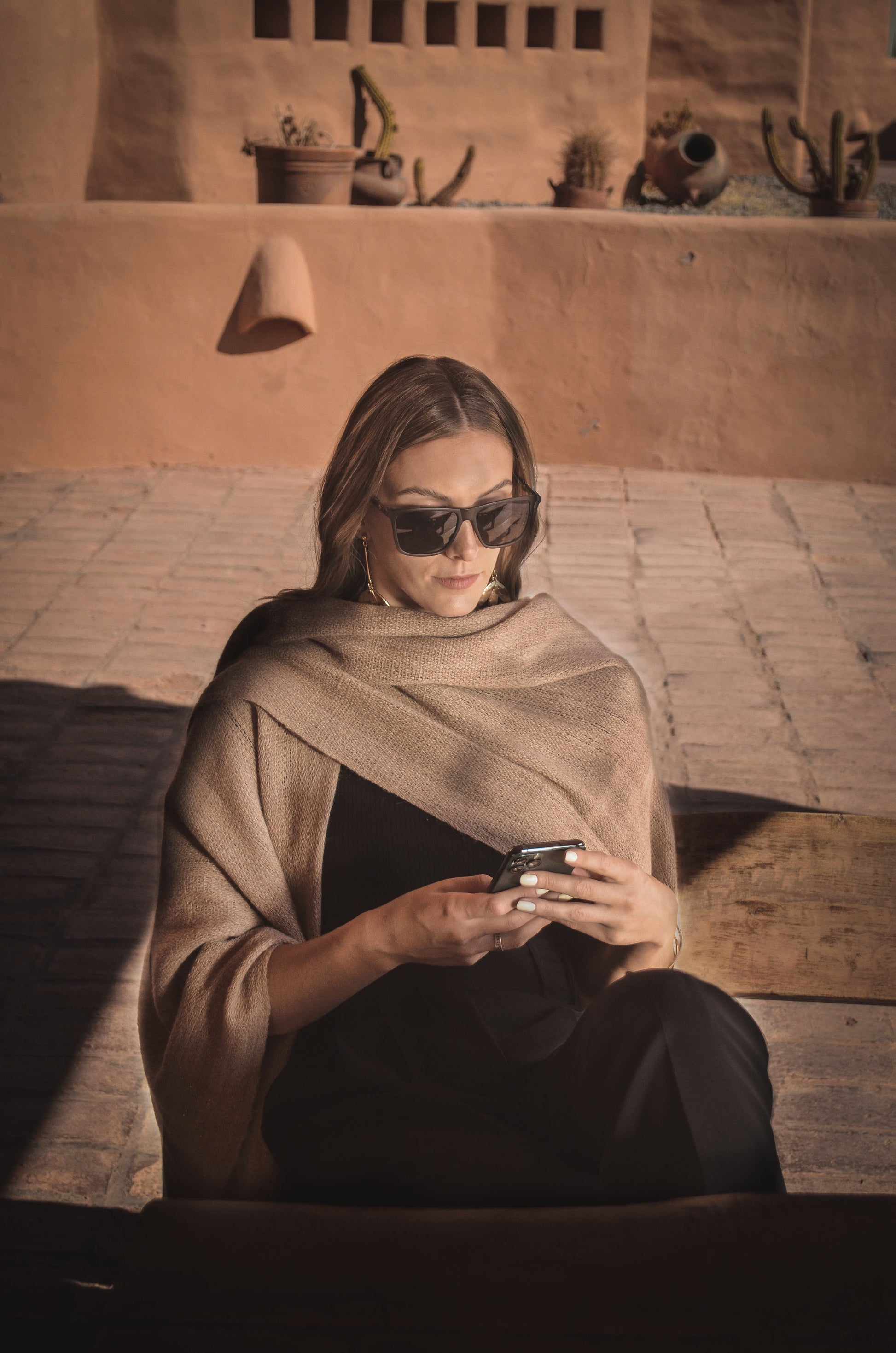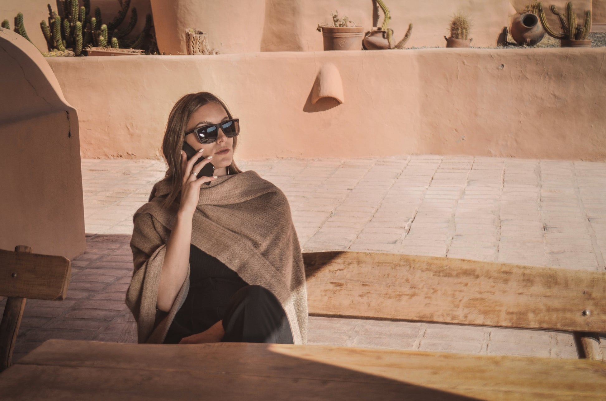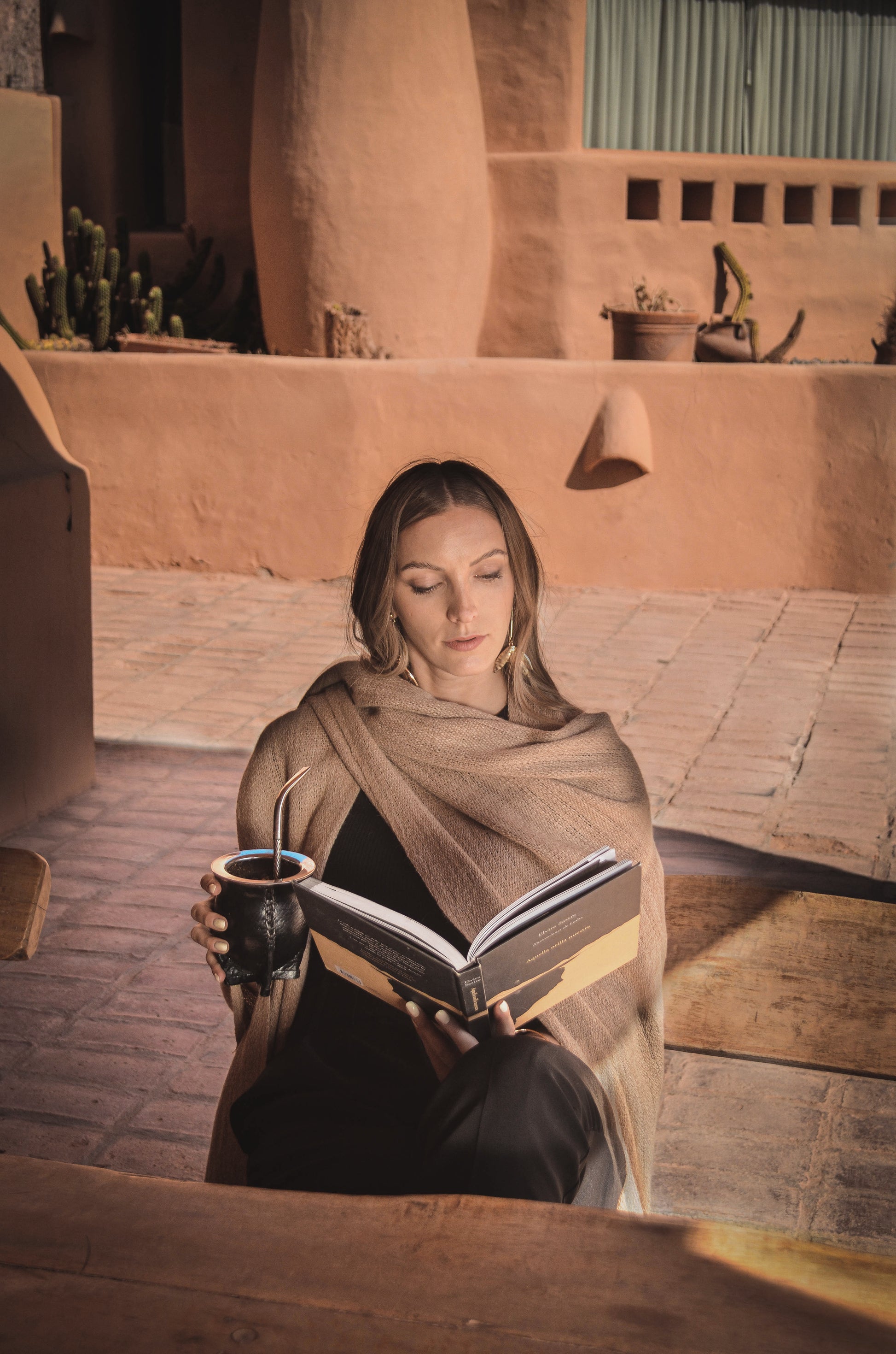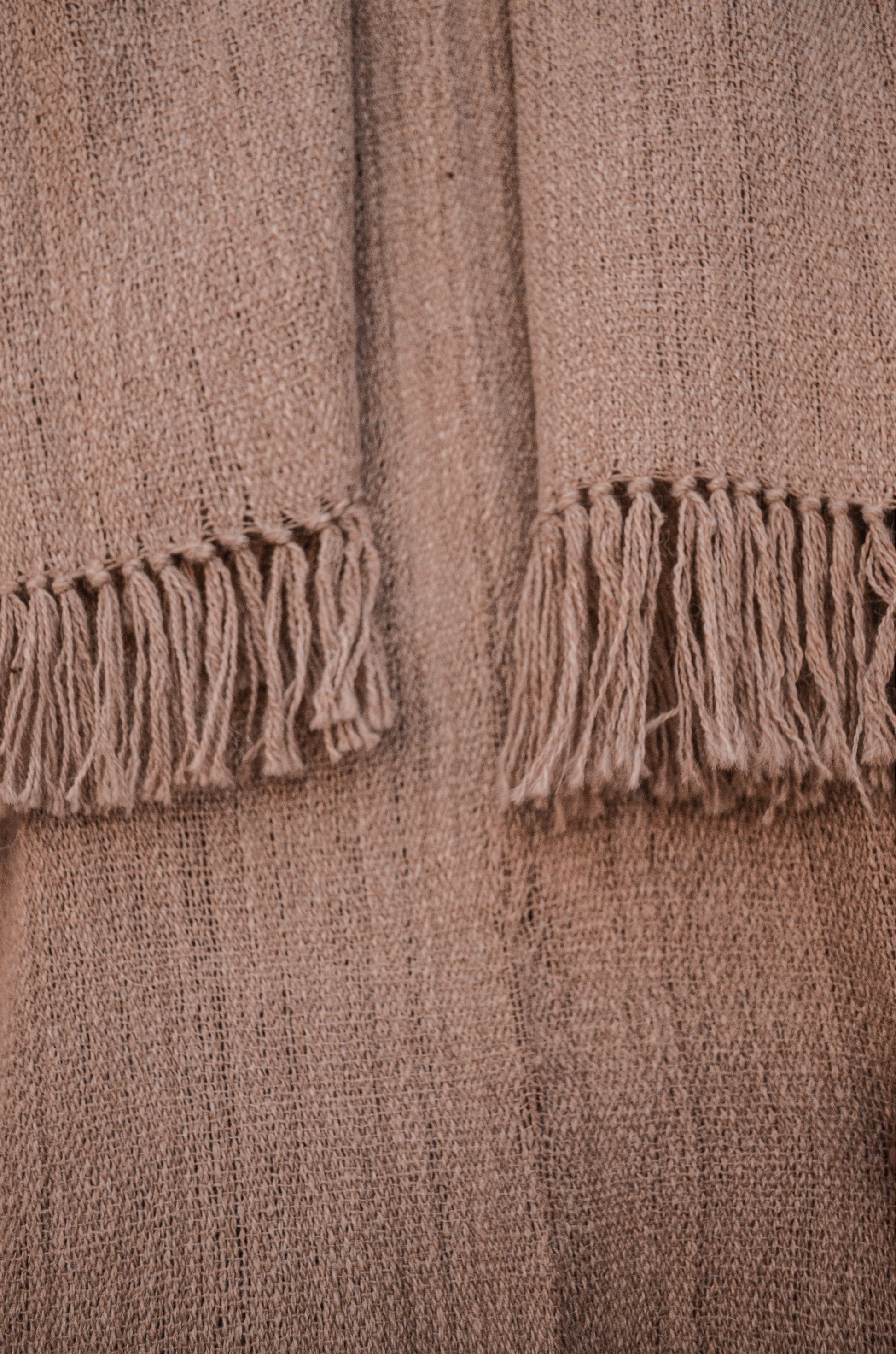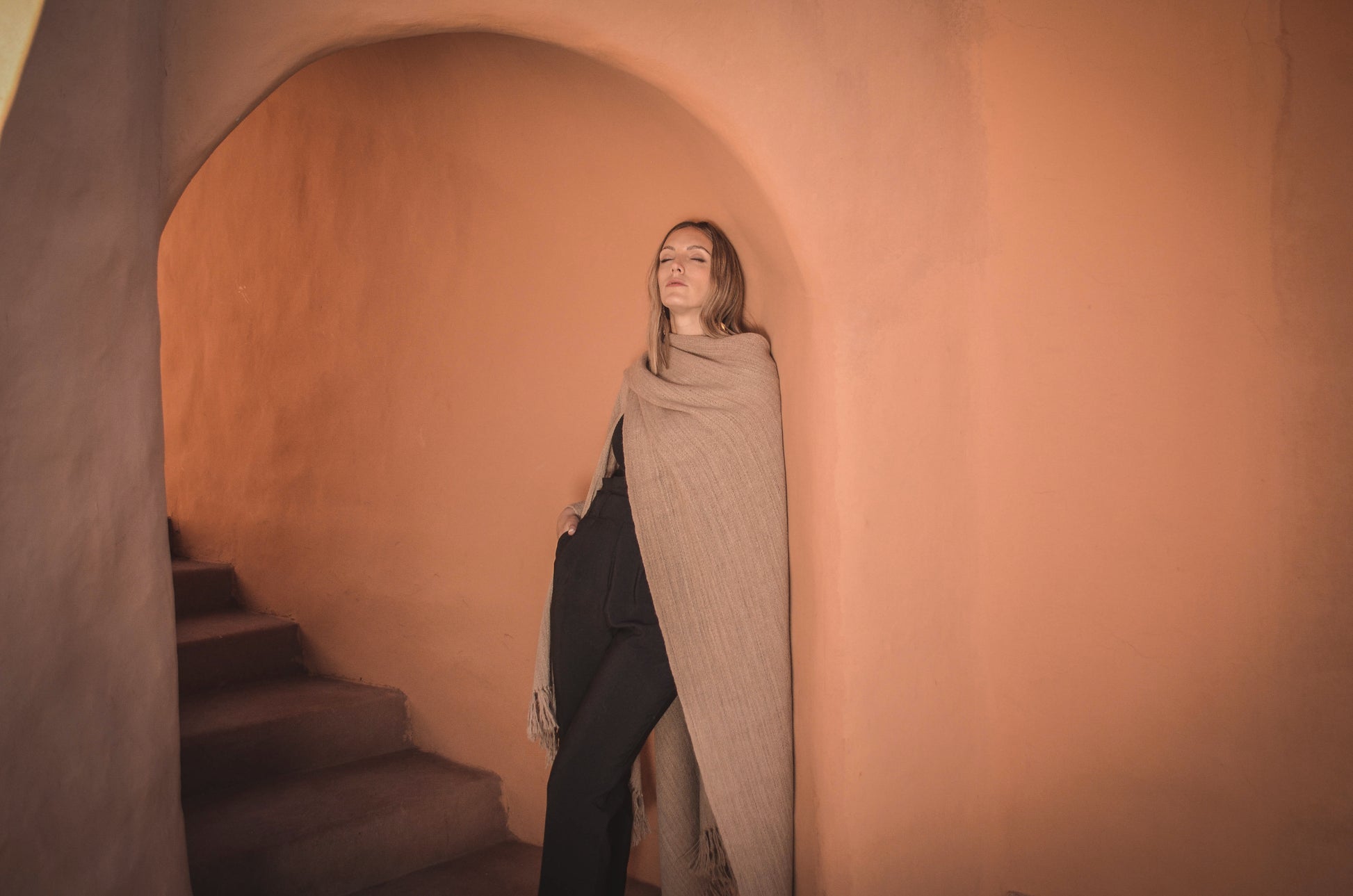 Ruana "Cafayate" es parte de la Colección "Runa" está hecha en telar a mano con hilos de lana de llama baby color camel.