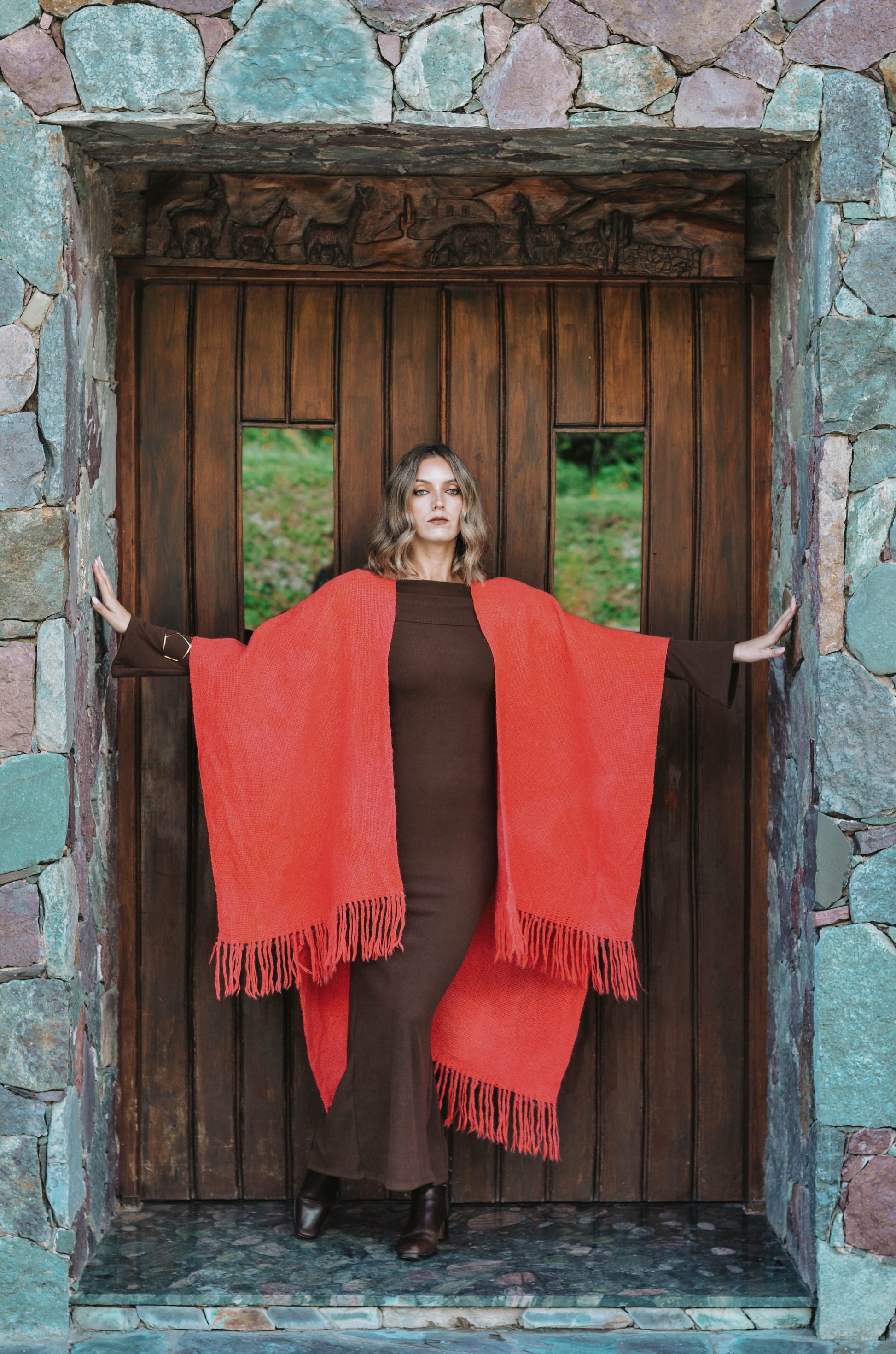Ruana "Patrona" está hecha a mano en telar rústico con hilos de llama baby.