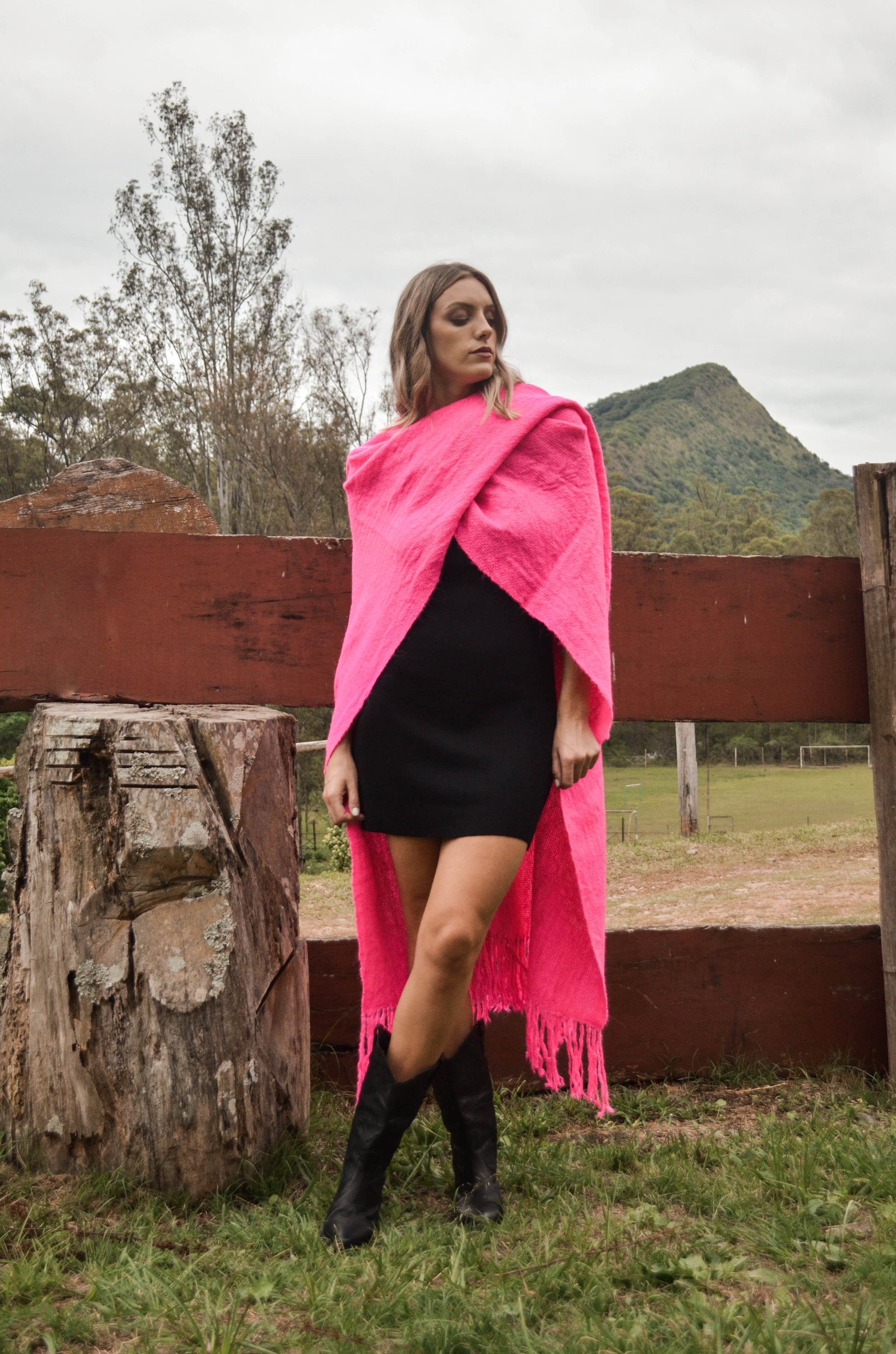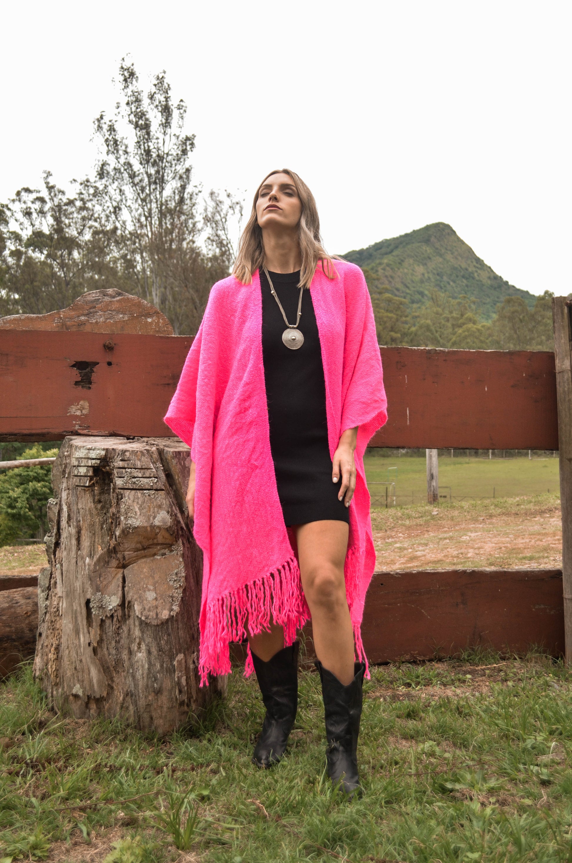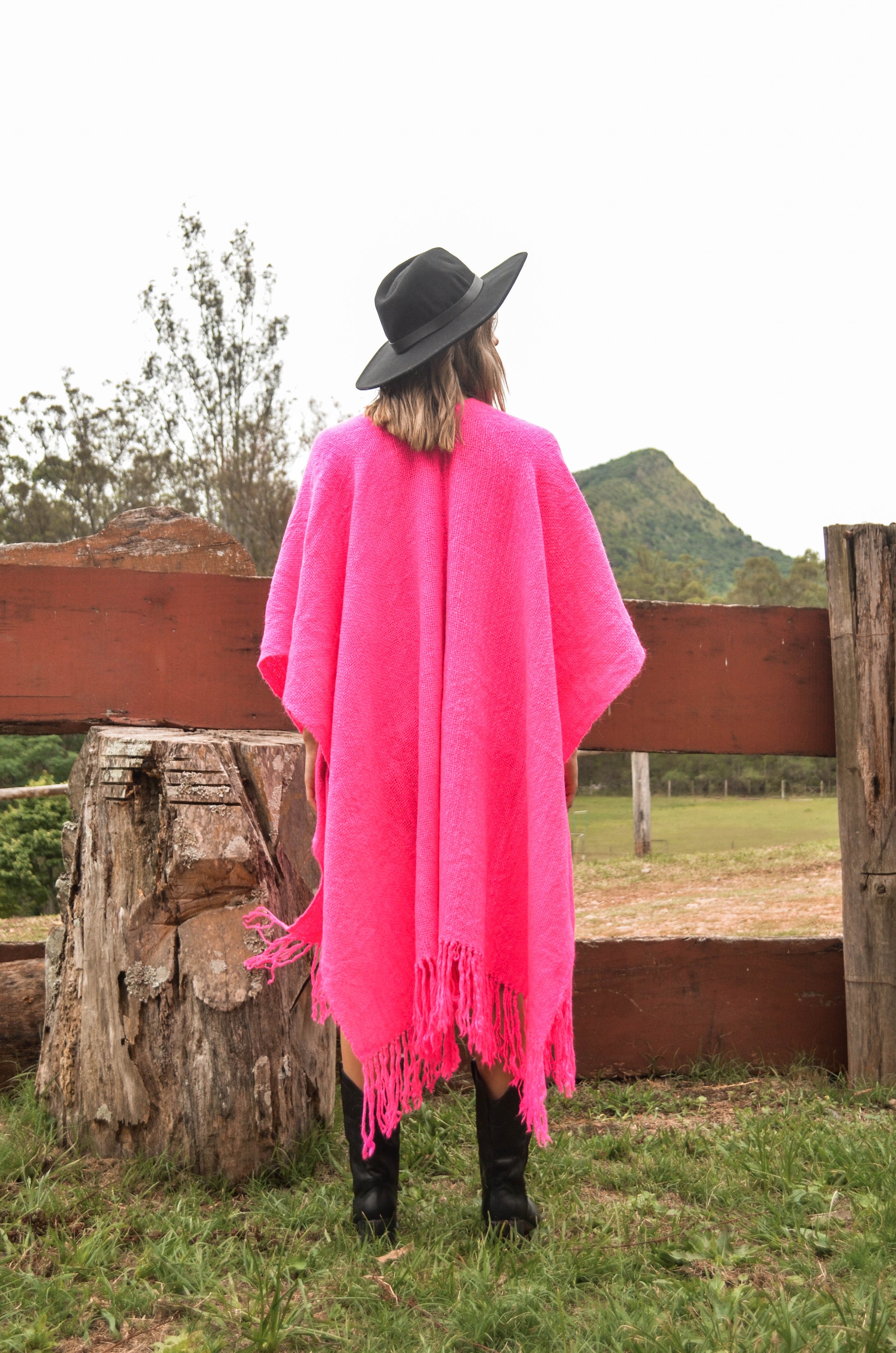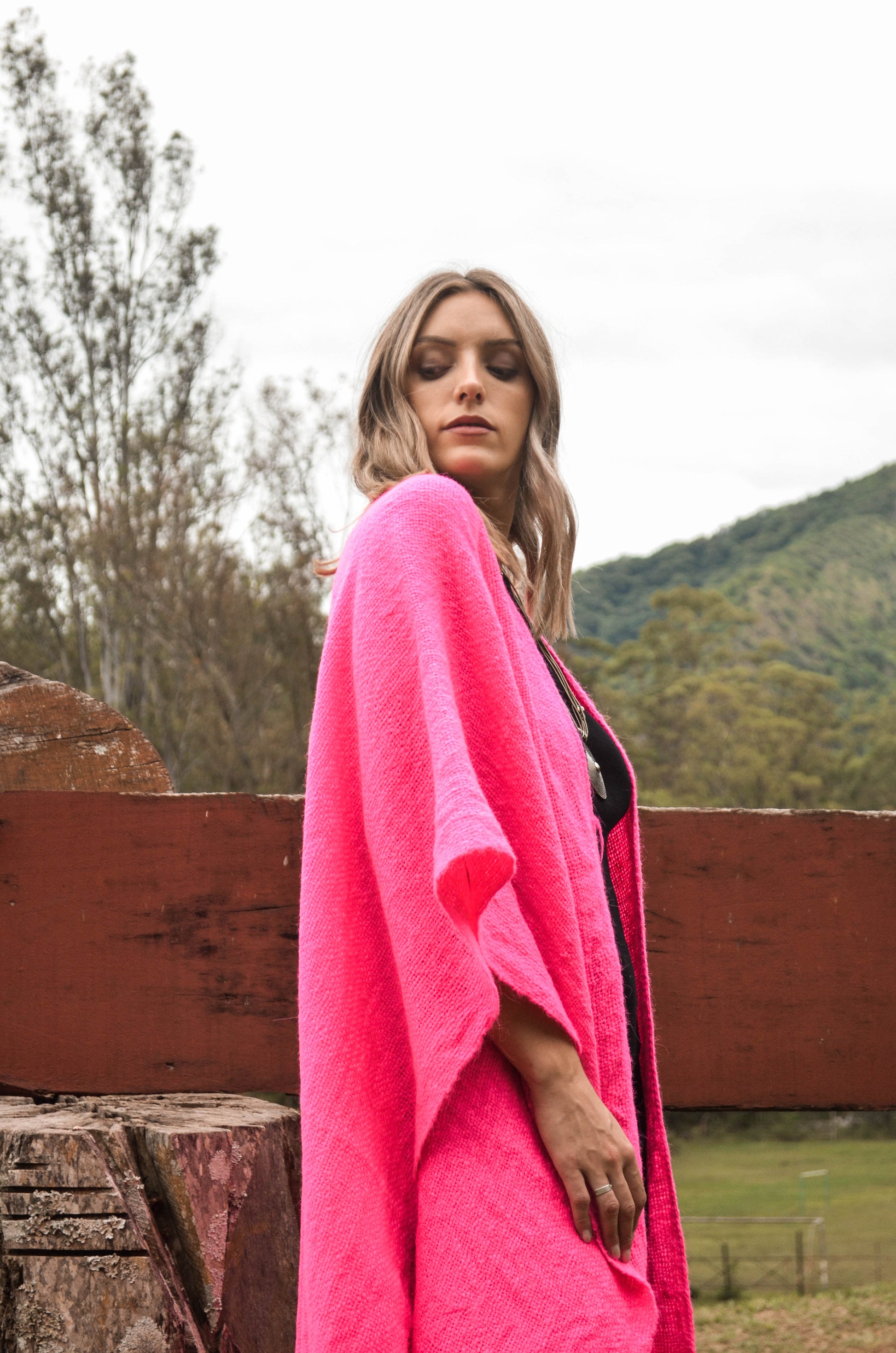 Ruana "Tulma" está hecha a mano en telar rústico con hilos de llama baby.
