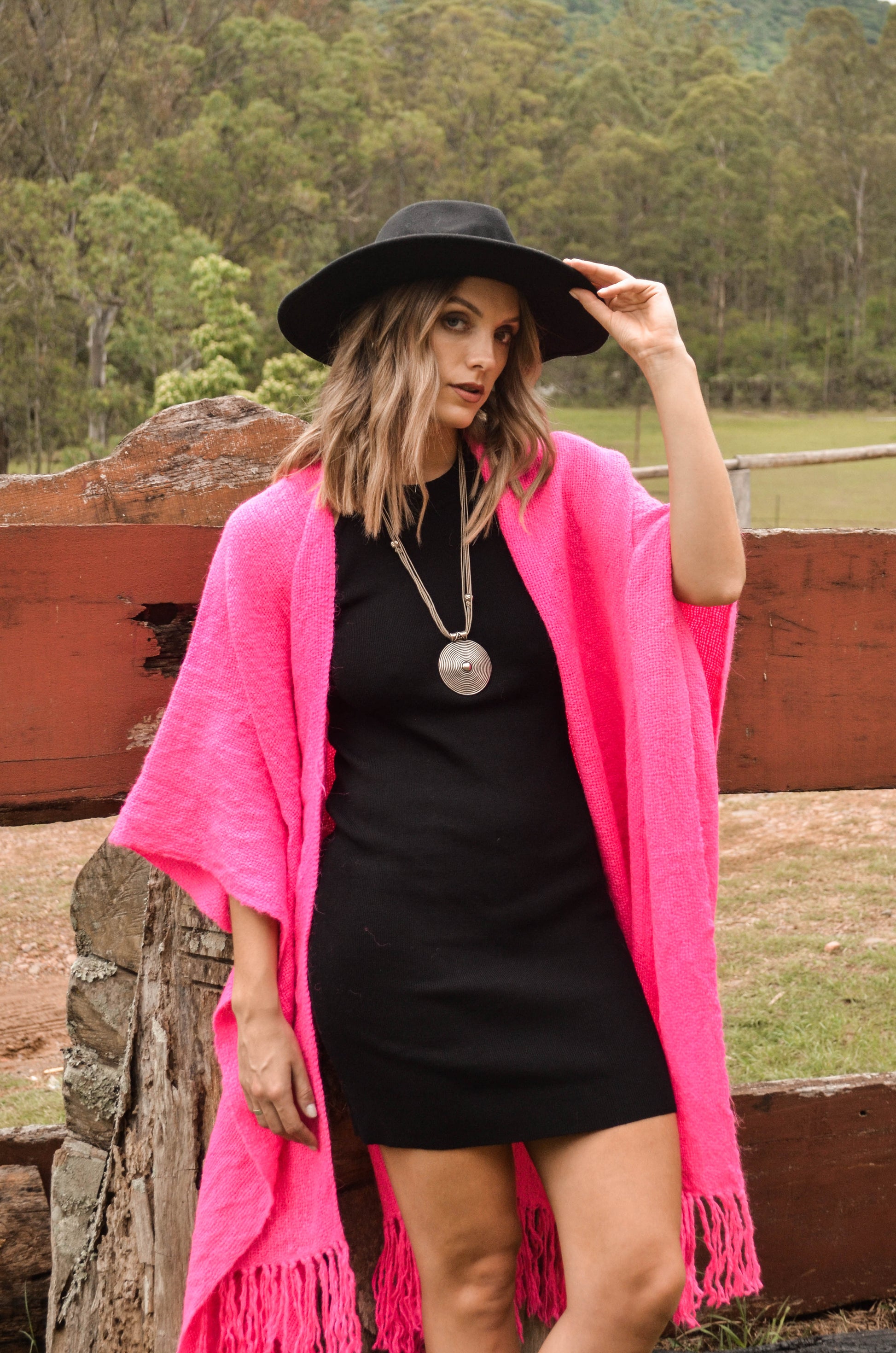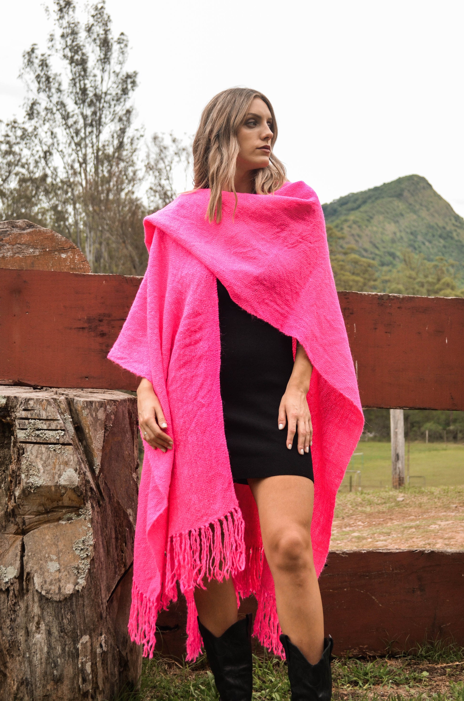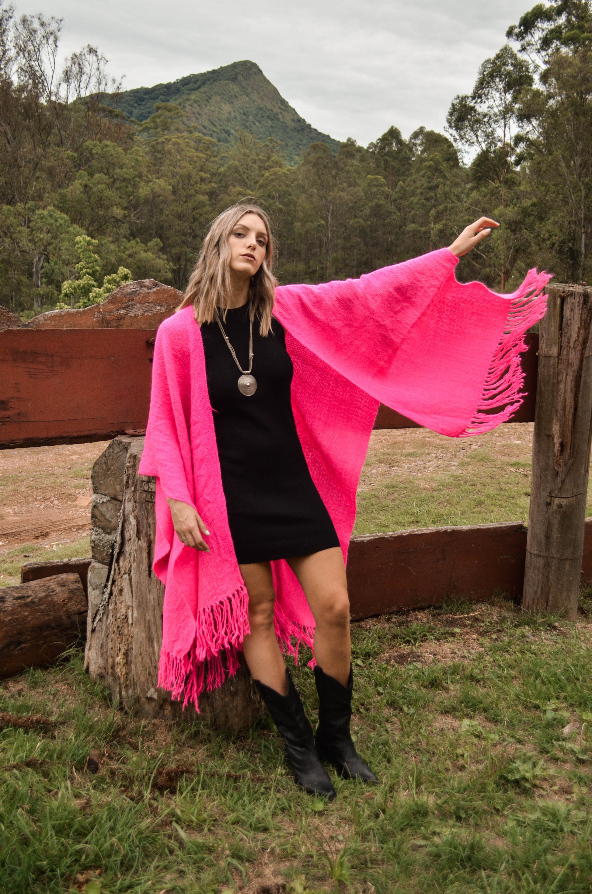 Ruana "Tulma" está hecha a mano en telar rústico con hilos de llama baby.