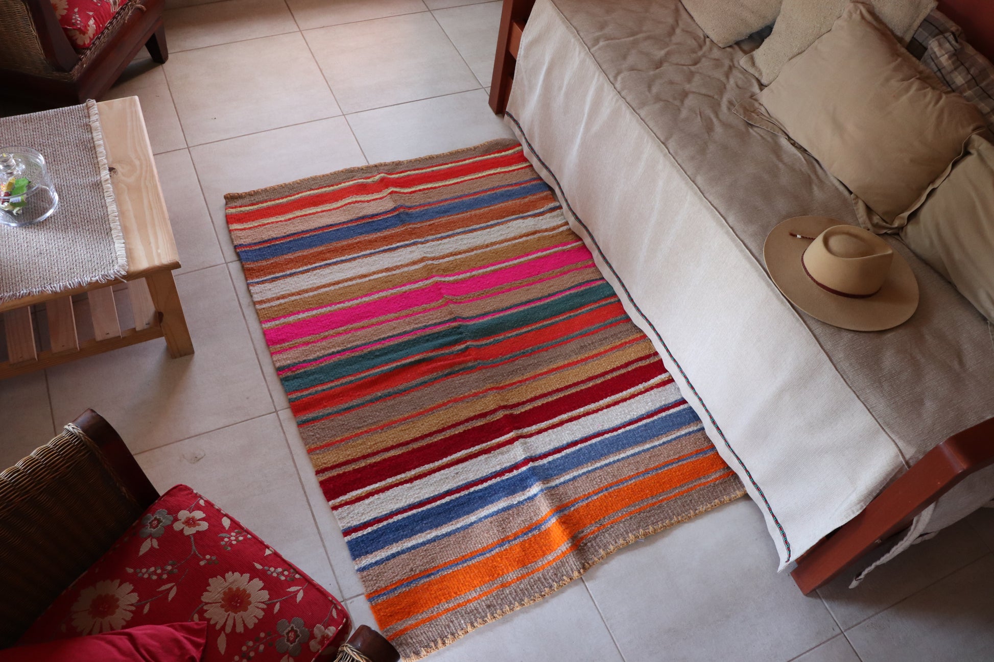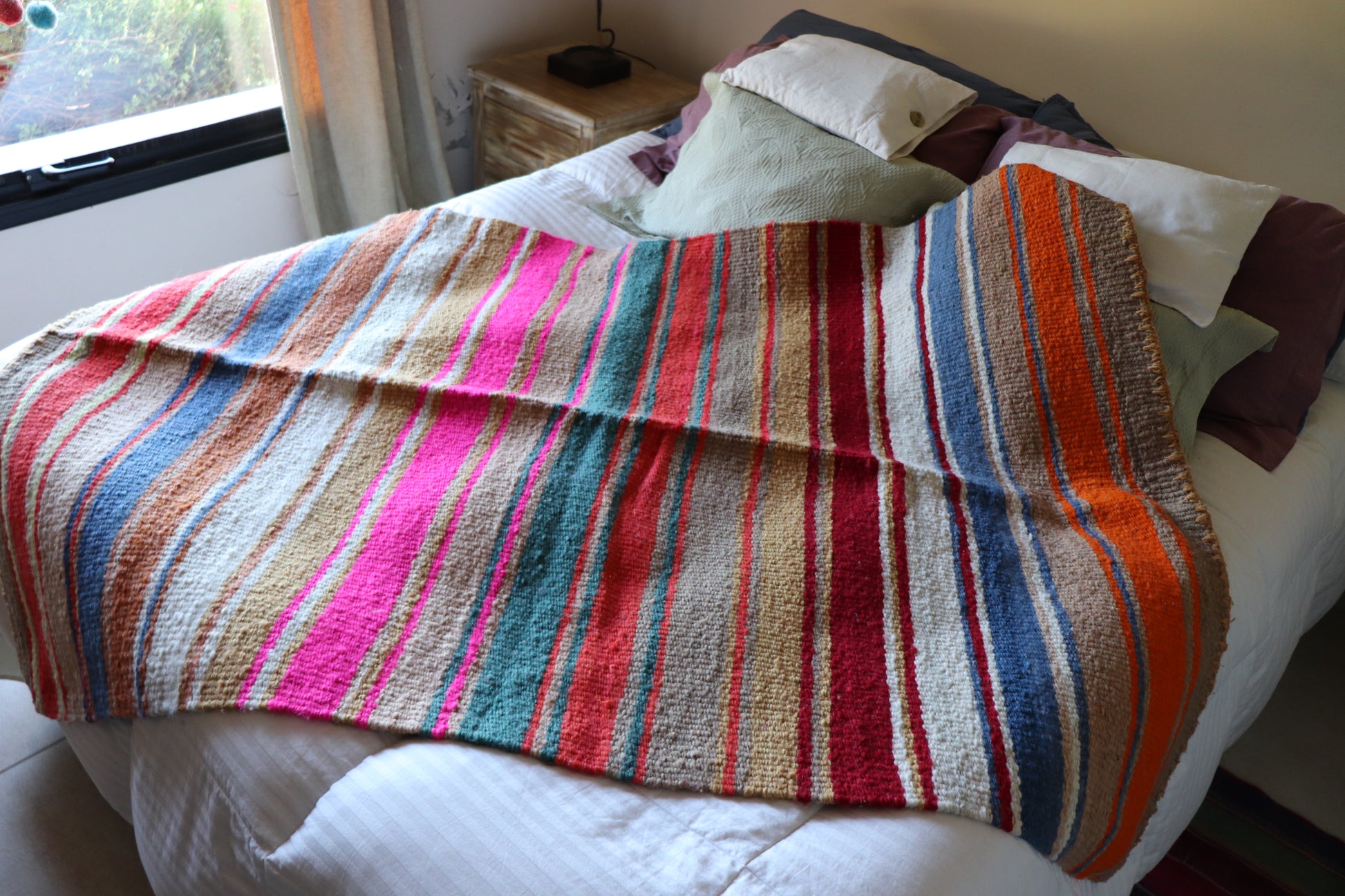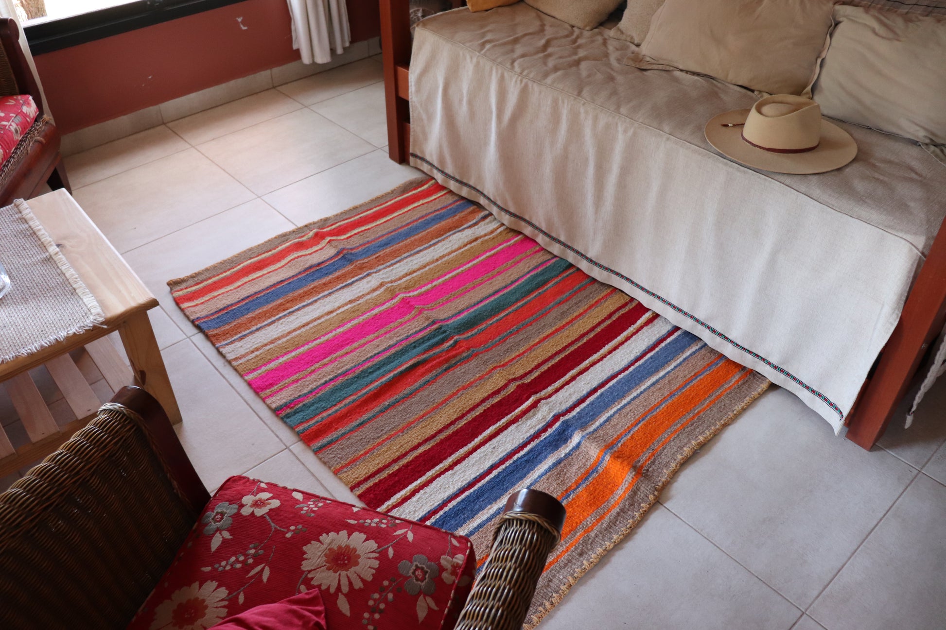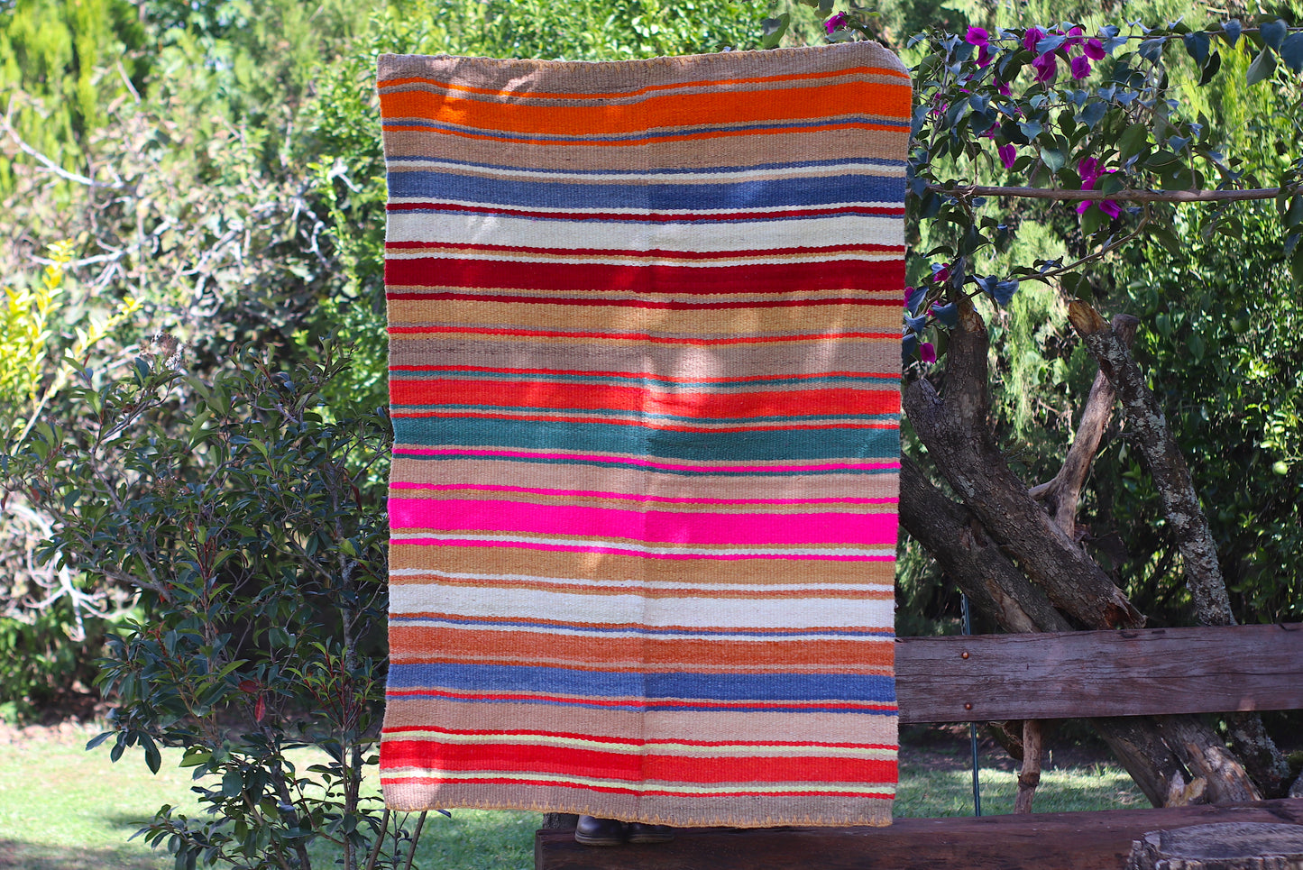 Alfombra de lana de oveja, hecha a mano en telar rústico.
