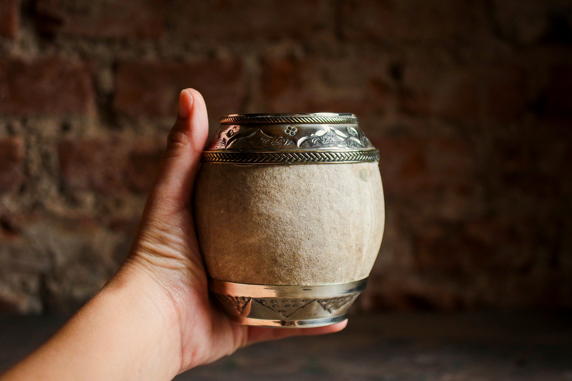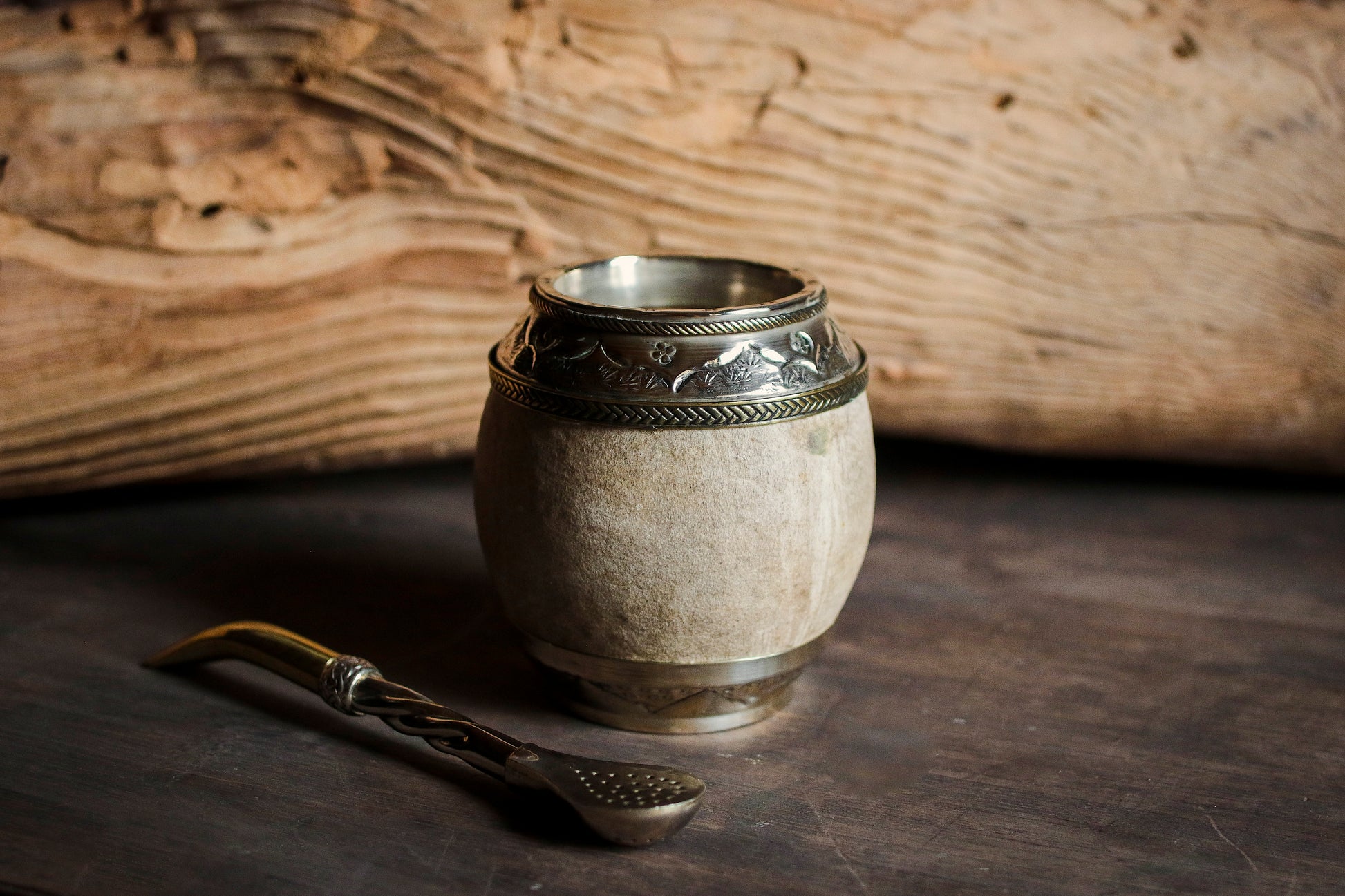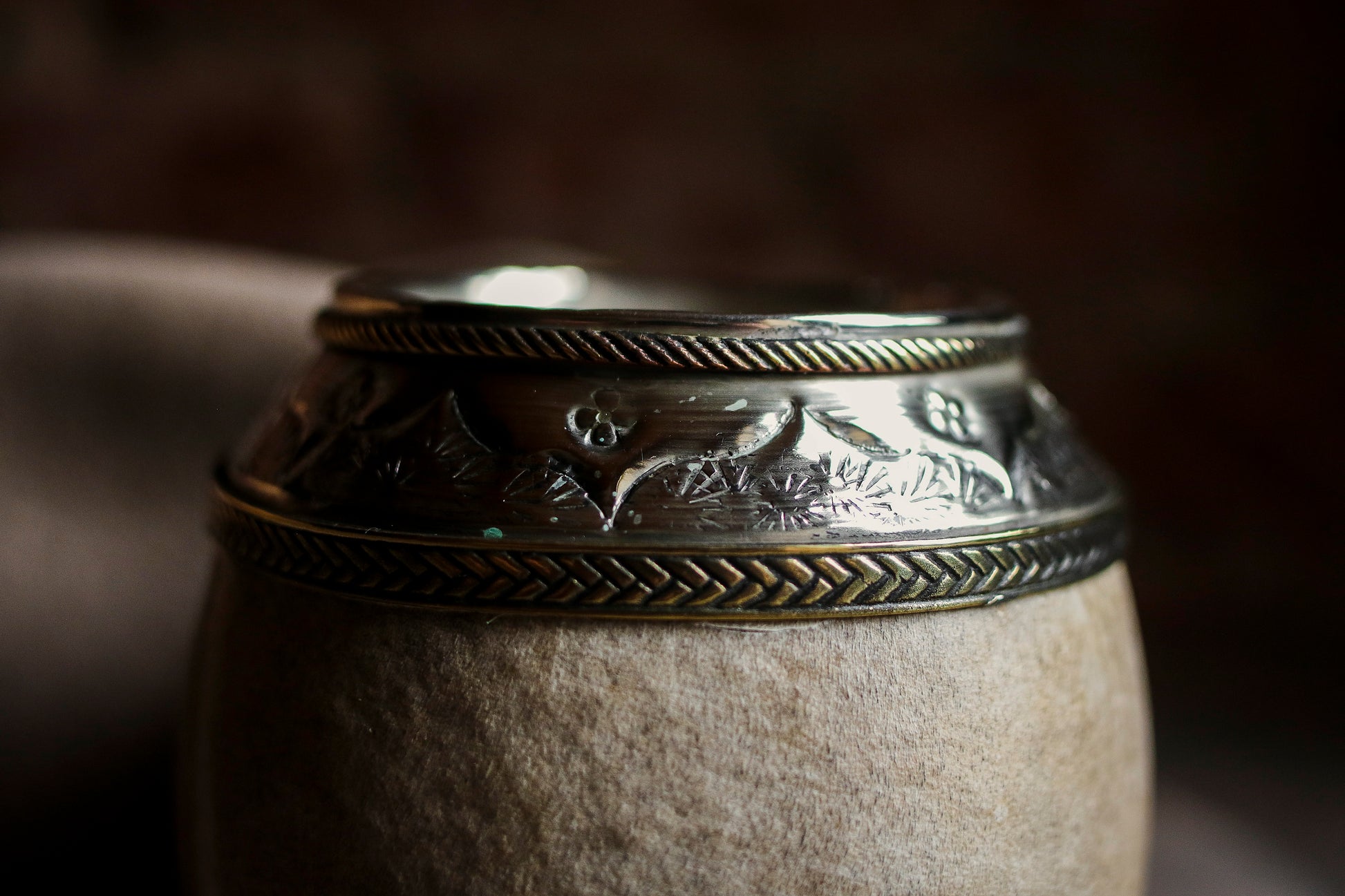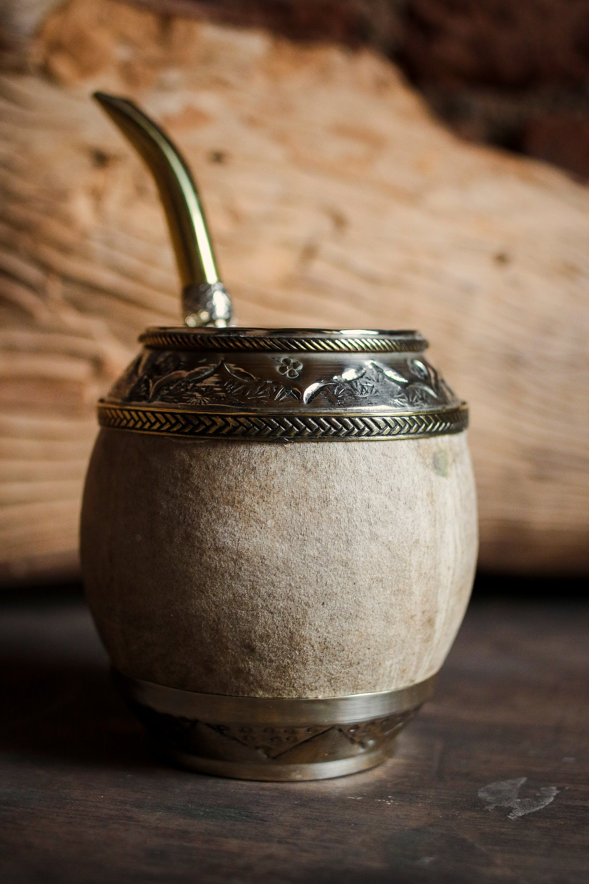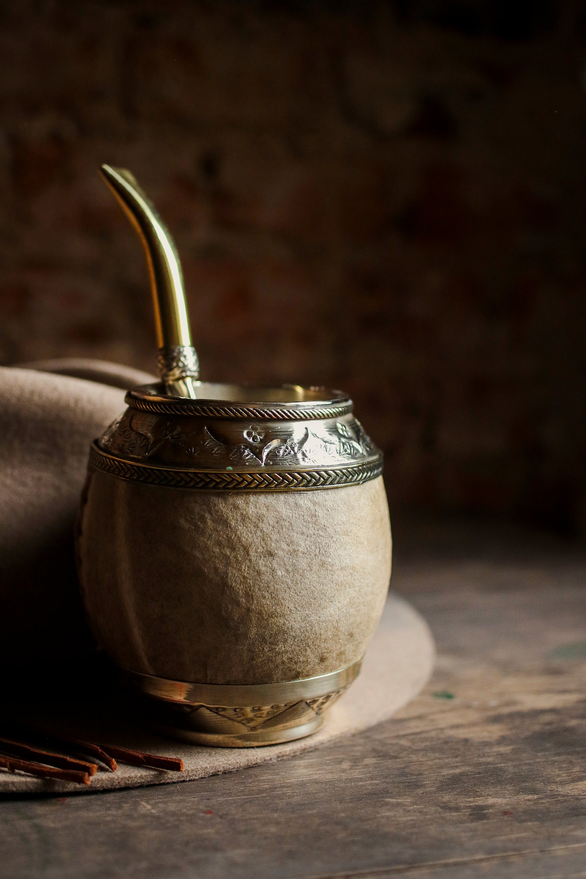 Torpedo criollo de cuero, bronce y alpaca con Bombilla